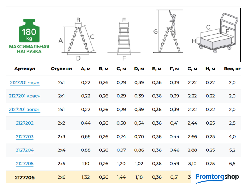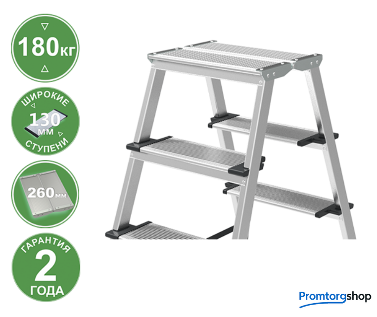 | Тип | лестница-стремянка, складная, неразборная. Усиленная стремянка для универсального применения с увеличенной верхней площадкой и широкими комфортными ступенями. Ноги не устают при длительной работе. складная площадка 260×350 мм из 2 ступеней. Увеличенный радиус работы. широкие комфортные ступени глубиной 130 мм. Меньше усталости при длительной работе. стойки и ступени из экструдированного алюминиевого профиля. заклёпочное крепление ступеней. Высокая статическая и динамическая прочность. закруглённые безопасные края ступеней и площадки смягчают контакт с голенью, предотвращают травмы. пластиковые повторяющие рельеф заглушки ступеней с длительным сроком службы скрывают острые грани и углы. компактно складывается для хранения и транспортировки. В сложенном состоянии занимает мало места. башмаки из 2х-компонентного пластика с прорезиненной опорой и большим пятном контакта 13 см2. Не скользят и не повреждают поверхность. |