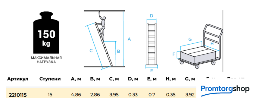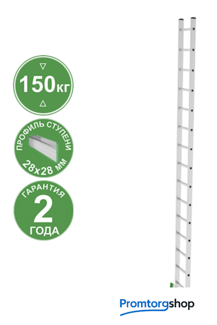 | Тип | приставная лестница, неразборная. Усиленная лестница для универсального использования снаружи и внутри помещений. Ширина секции: 340 мм. Профиль стоек: 71×23 мм. Увеличенные рифлёные перекладины 28×28 мм для надёжного сцепления. Наконечники стоек из прочного пластика сверху и снизу лестницы. Широкая опорная траверса стабилизирует конструкцию. Вальцовочное крепление перекладин. По прочности не уступает сварке. Башмаки траверсы из 2х-компонентного пластика с прорезиненной опорой. Не скользят и не повреждают поверхность. |