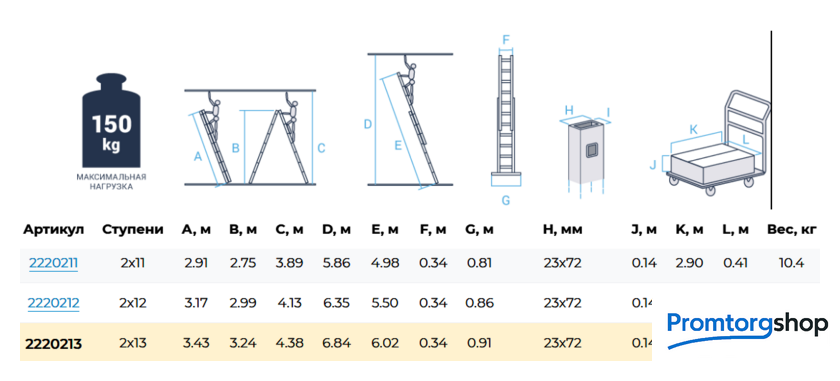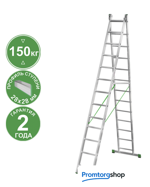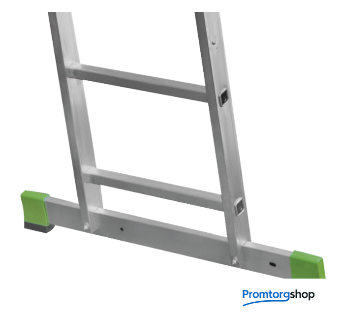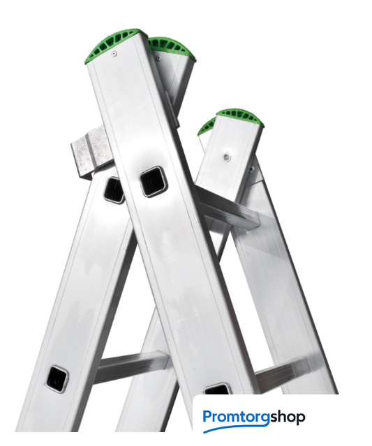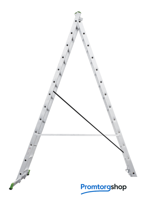 | Тип | лестница секционная, складная. Усиленная лестница с перекладинами «3 в 1»: приставная лестница, приставная раздвижная лестница, стремянка. Для краткосрочных работ и частного применения. Сделана из экструдированного алюминия. Высокая прочность при лёгком весе. Ширина верхней секции - 340 мм, ширина нижней секции - 400 мм. 2х-компонентный пластик на наконечниках траверсы. Большое (1200 мм2) пятно контакта. Не скользит и не повреждает поверхность. Съёмная траверса стабилизирует конструкцию. Страховочные ремни на заклёпках с увеличенной шляпкой. Алюминиевая стяжка в положении «Стремянка» создает жёсткую конструкцию и фиксирует рабочее положение. Вальцовочное соединение перекладин. По прочности не уступает сварке. Увеличенные рифлёные перекладины 28x28 мм. 2 зацепа и автоматический фиксатор секции на нужном шаге. |