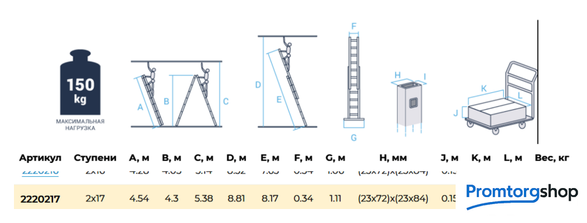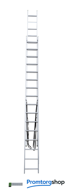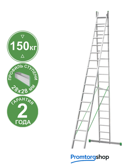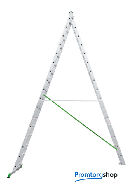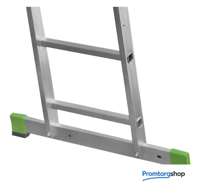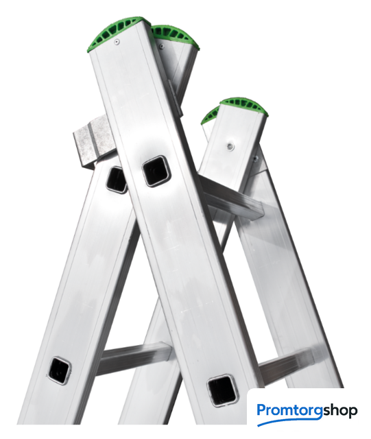 | Тип | лестница секционная, складная. Усиленная лестница с перекладинами «3 в 1»: приставная лестница, приставная раздвижная лестница, стремянка. Для краткосрочных работ и частного применения. Сделана из экструдированного алюминия. Высокая прочность при лёгком весе. Ширина верхней секции - 340 мм, ширина нижней секции - 400 мм. 2х-компонентный пластик на наконечниках траверсы. Большое (1200 мм2) пятно контакта. Не скользит и не повреждает поверхность. Съёмная траверса стабилизирует конструкцию. Страховочные ремни на заклёпках с увеличенной шляпкой. Алюминиевая стяжка в положении «Стремянка» создает жёсткую конструкцию и фиксирует рабочее положение. Вальцовочное соединение перекладин. По прочности не уступает сварке. Увеличенные рифлёные перекладины 28x28 мм. 2 зацепа и автоматический фиксатор секции на нужном шаге. |
