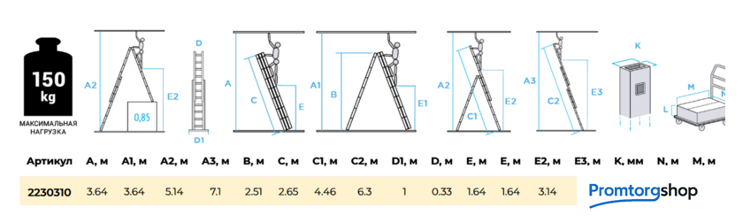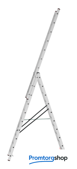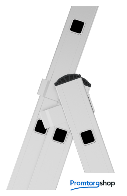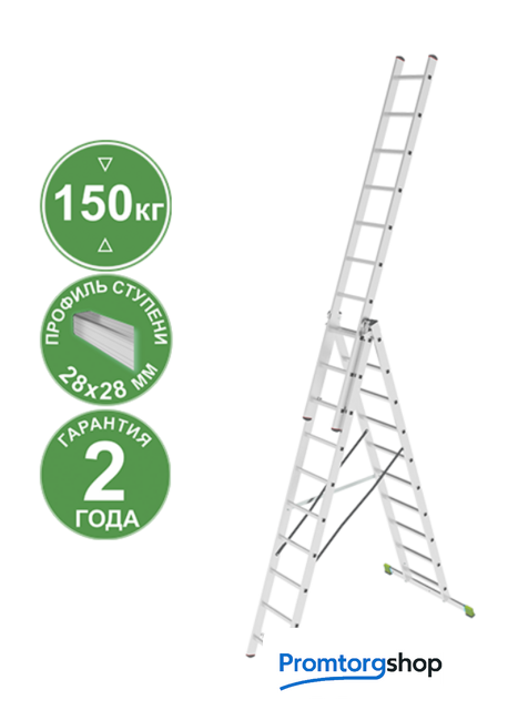 | Тип | лестница секционная. Универсальная усиленная трехсекционная лестница «7 в 1»: приставная лестница, приставная выдвижная лестница, стремянка, стремянка с выдвинутой секцией, функция «лестничный пролёт» (возможность установки на разноуровневой поверхности), две отдельных приставных лестницы (односекционная и двухсекционная). Ширина верхней секции - 330 мм, ширина нижней секции - 460 мм.. Рифлёные перекладины 28x28 мм для надёжного сцепления. Улучшенная геометрия профиля Верхняя секция может использоваться как отдельная приставная лестница Высокая прочность и надёжность при лёгком весе Стойки и ступени из экструдированных алюминиевых профилей Шаг ступеней 260 мм 32-кратная завальцованное соединение ступеней со стойками Алюминиевые направляющие кронштейны для надёжного удержания выдвижной секции Зацепы с автоматическим фиксатором Широкая поперечная траверса для максимальной устойчивости Опорные наконечники-башмаки траверсы из прочного двухкомпонентного пластика. Жёсткий компонент обеспечивает надежность крепления, мягкий препятствует скольжению лестницы Дополнительная жёсткая поперечная стяжка Прочные свето- и атмосфероустойчивые страховочные ремни 25 мм на заклёпках |