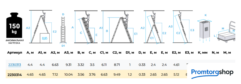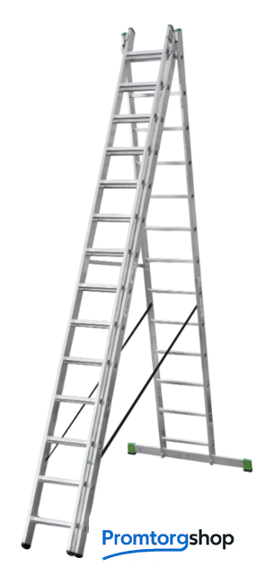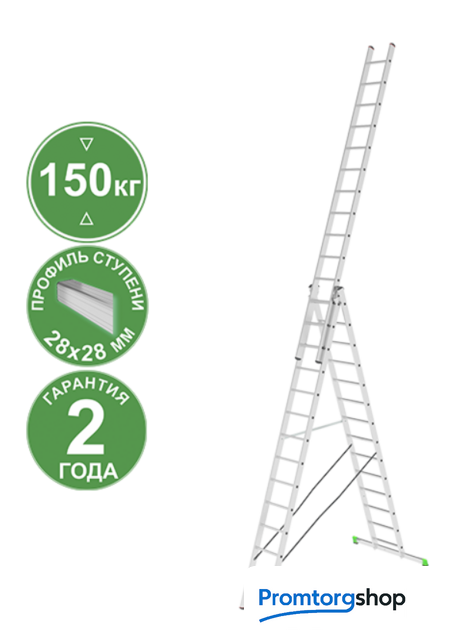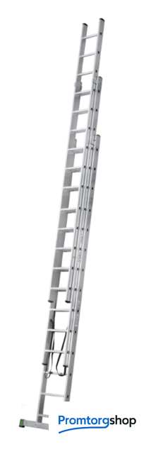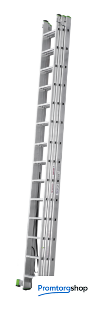 | Тип | лестница секционная, складная. Универсальная усиленная трехсекционная лестница «7 в 1»: приставная лестница, приставная выдвижная лестница, стремянка, стремянка с выдвинутой секцией, функция «лестничный пролёт» (возможность установки на разноуровневой поверхности), две отдельных приставных лестницы (односекционная и двухсекционная). Ширина верхней секции - 330 мм, ширина нижней секции - 460 мм.. Рифлёные перекладины 28x28 мм для надёжного сцепления. Улучшенная геометрия профиля Верхняя секция может использоваться как отдельная приставная лестница Высокая прочность и надёжность при лёгком весе Стойки и ступени из экструдированных алюминиевых профилей Шаг ступеней 260 мм 32-кратная завальцованное соединение ступеней со стойками Алюминиевые направляющие кронштейны для надёжного удержания выдвижной секции Зацепы с автоматическим фиксатором Широкая поперечная траверса для максимальной устойчивости Опорные наконечники-башмаки траверсы из прочного двухкомпонентного пластика. Жёсткий компонент обеспечивает надежность крепления, мягкий препятствует скольжению лестницы Дополнительная жёсткая поперечная стяжка Прочные свето- и атмосфероустойчивые страховочные ремни 25 мм на заклёпках |