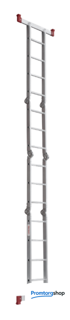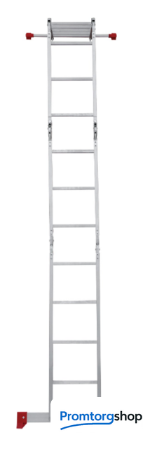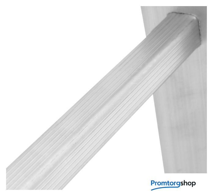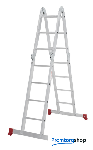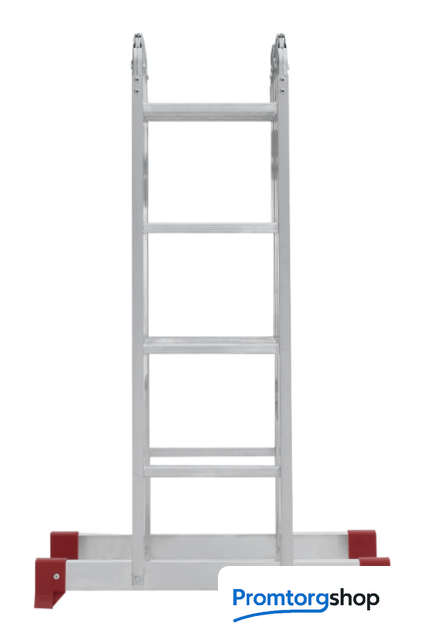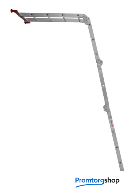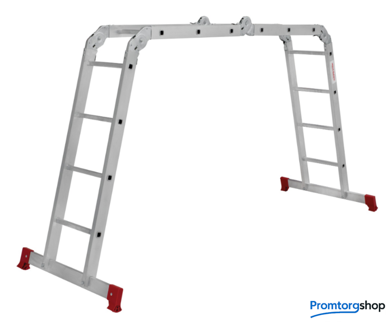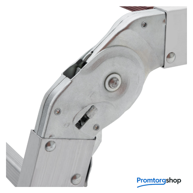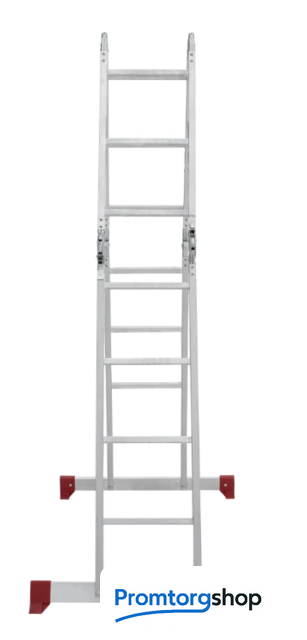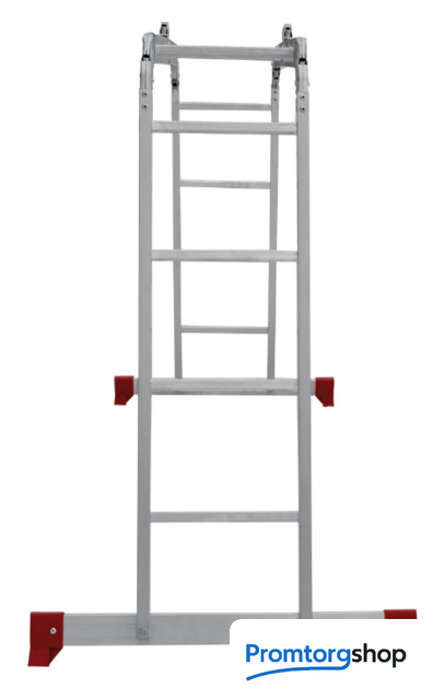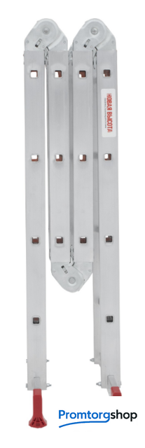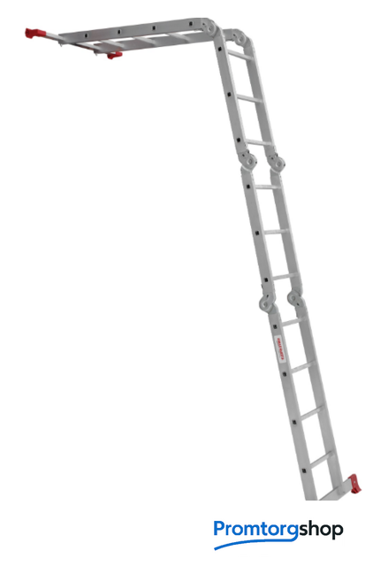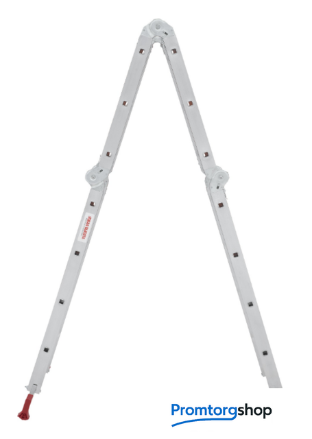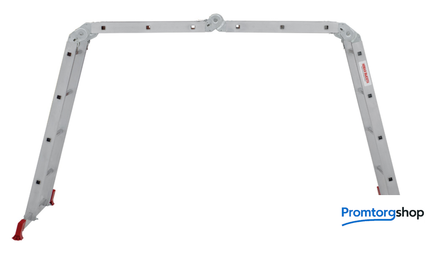 | Тип | лестница-трансформер, неразборная, складная. Варианты использования: приставная лестница стремянка приставная согнутая лестница помост Технические преимущества: максимальная прочность и надёжность при небольшом весе изделия. ступени с рифлением для безопасного подъёма и спуска. стойки и ступени изготовлены из прессованного алюминиевого профиля. стойки с дополнительным усилием в наиболее нагруженных местах для повышения жёсткости. многократная развальцовка в соединении ступеней со стойками обеспечивает высокую прочность и долговечность. шарнирные замки регулируются одной рукой. надёжная автоматическая фиксация. широкие поперечные траверсы обеспечивают высокую устойчивость при работе во всех положениях. башмаки траверсы препятствуют скольжению. Они надёжно закреплены с помощью заклёпок. Страна производства: Россия |