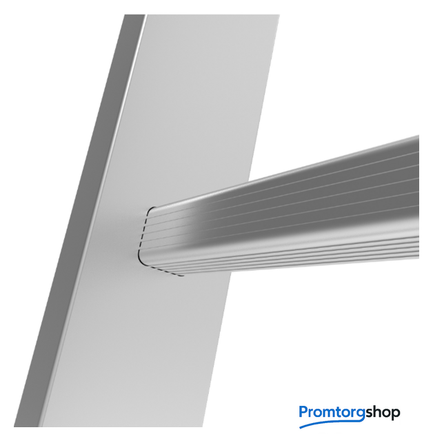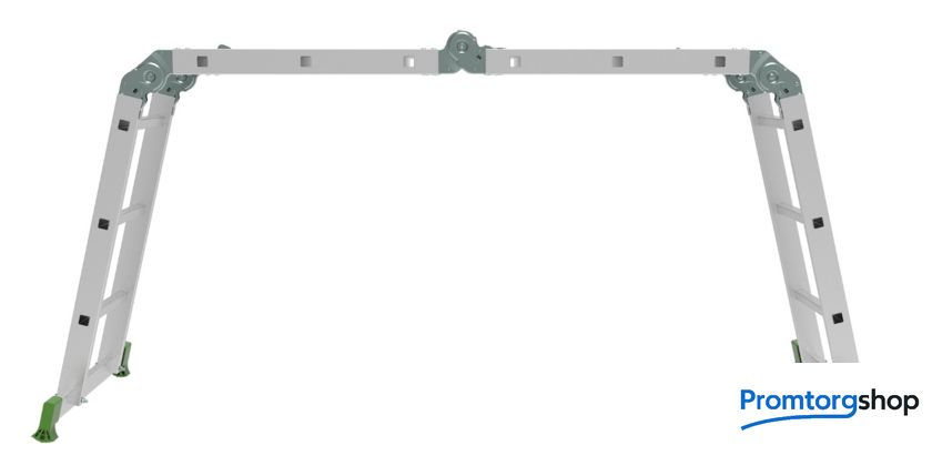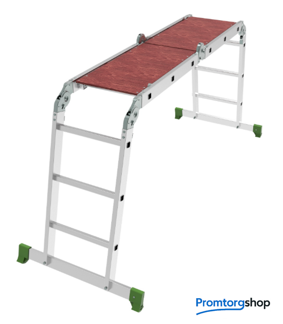 | Тип | лестница-трансформер, неразборная, складная. Многофункциональная улучшенная шарнирная лестница «4 в 1» увеличенной шириной для бытового использования с повышенными нагрузками: приставная, Г-образная с опорой на стену, двухсторонняя стремянка, помост со съёмным настилом. Съёмный настил из антисептированной фанеры для положения «Помост» в комплекте. Увеличенная ширина 400 мм. Больше пространства и манёвра для работы. Увеличенные рифлёные перекладины 28×28 мм для надежного сцепления. Шарнирные замки с автоматической фиксацией регулируются одной рукой. Стойки и перекладины из экструдированного алюминиевого профиля. Усиленная конструкция профиля стоек для максимальной прочности. Вальцовочное крепление перекладин. По прочности не уступает сварке. 2 широкие съёмные опорные траверсы стабилизируют конструкцию. Башмаки траверс из 2х-компонентного пластика с прорезиненной опорой. Не скользят и не повреждают поверхность. Страна производства: Россия |