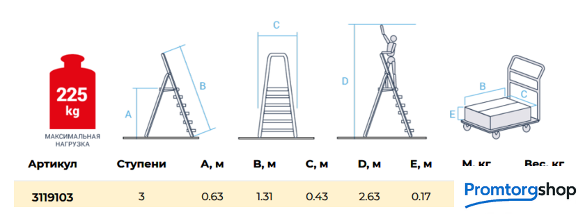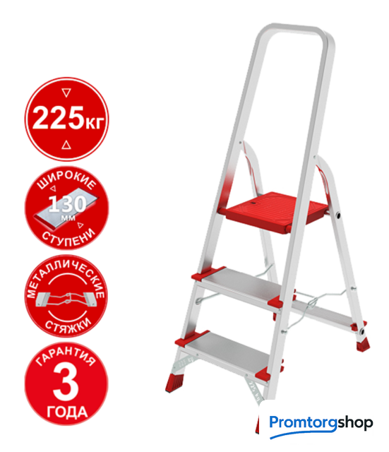 | Тип | лестница-стремянка,складная, неразборная. Профессиональная стремянка повышенной прочности и надёжности с максимальной нагрузкой 225 кг, с широкими комфортными ступенями 130 см и металлическим надежными стяжками. широкие ступени глубиной 130 мм жесткие металлические стяжки для надежной фиксации в рабочем положении повышенная прочность и надёжность при небольшом весе изделия ступени и стойки из прессованных алюминиевых профилей увеличенного сечения рифлёная поверхность ступеней для безопасного подъёма и спуска прочное крепление ступеней к боковинам шестью заклёпками для более высокой устойчивости конструкции безопасная рифлёная площадка из оцинкованной стали с порошковой покраской дуга безопасности 600 мм опорные наконечники из прочного пластика для устойчивого положения компактность при хранении и транспортировке |