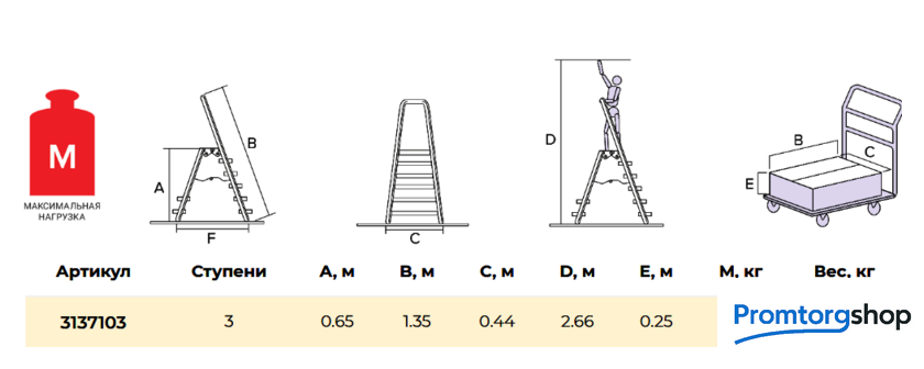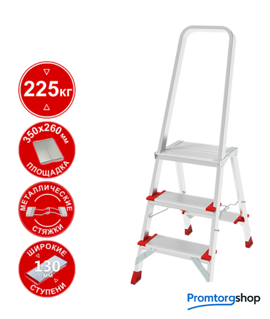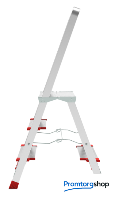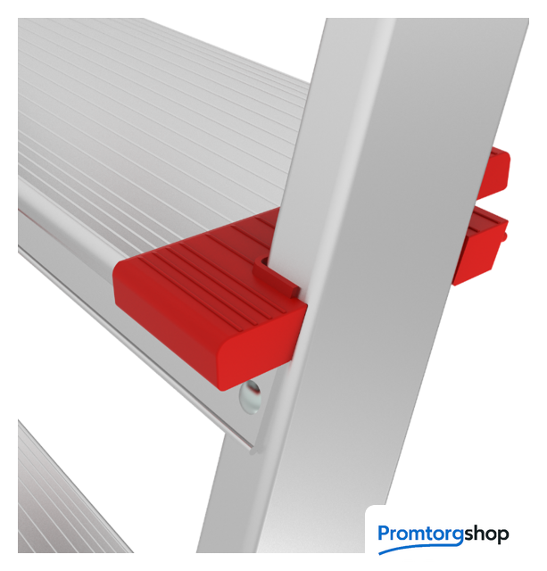 | Тип | лестница-стремянка,складная, неразборная. Профессиональная стремянка для интенсивного использования с широкой складной площадкой, жесткими стяжками и широкими комфортными ступенями. Широкие ступени глубиной 130 мм увеличенной толщины Складная безопасная площадка 260x350 мм c рифлёной поверхностью Высокая прочность и надёжность при небольшом весе изделия Простота установки и высокий уровень комфорта Ступени и стойки из экструдированных алюминиевых профилей увеличенного сечения Рифлёная поверхность ступеней для безопасного подъёма и спуска Прочное крепление ступеней к боковинам шестью стальными заклёпками для более высокой Опорная ступень 80 мм и дополнительная ступень 130 мм для сидения на заднем каркасе Дуга безопасности 600 мм Прочные стяжки из стальной проволоки для надёжной фиксации в рабочем положении Опорные наконечники из прочного пластика для устойчивого положения Компактность при хранении и транспортировке Практичность и внимание к каждой детали гарантируют безопасность работы на любой высоте |