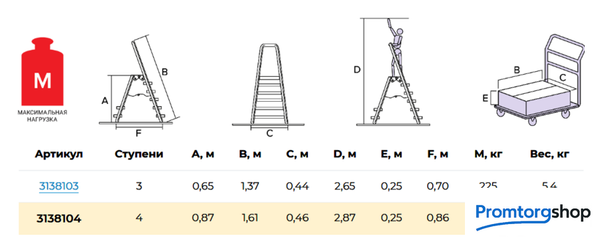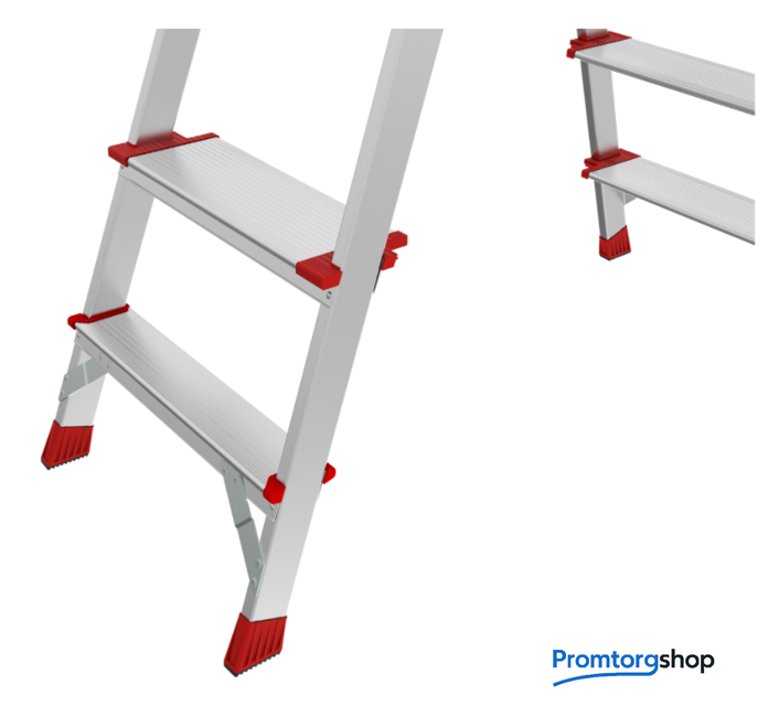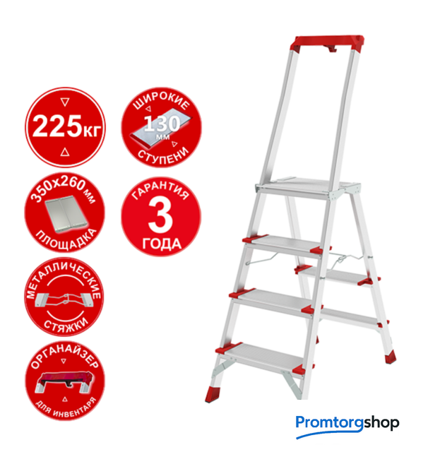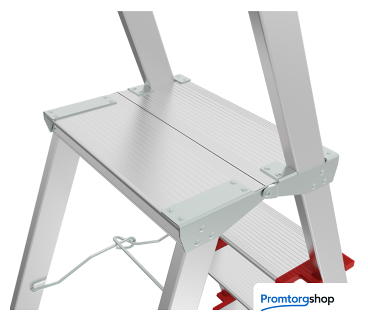 | Тип | лестница-стремянка,складная, неразборная. Профессиональная стремянка для интенсивного использования с широкой складной площадкой, жесткими стяжкам, органайзером и широкими, комфортными ступенями. Широкие ступени глубиной 130 мм увеличенной толщины. Вместительный лоток-органайзер для инструментов и материалов Большая безопасная рифлёная складная площадка 260x350 мм. Ступени и стойки из экструдированных алюминиевых профилей увеличенного сечения. Рифлёная поверхность ступеней для безопасного подъёма и спуска. Прочное крепление ступеней к боковинам шестью стальными заклёпками для высокой устойчивости конструкции. Дополнительная опорная ступень и место для сидения на заднем каркасе. Дуга безопасности 600 мм. Прочные стяжки из стальной проволоки для надёжной фиксации в рабочем положении. Опорные наконечники из прочного пластика для устойчивого положения. Компактность при хранении и транспортировке. Практичность и внимание к каждой детали гарантируют безопасность работы на любой высоте |