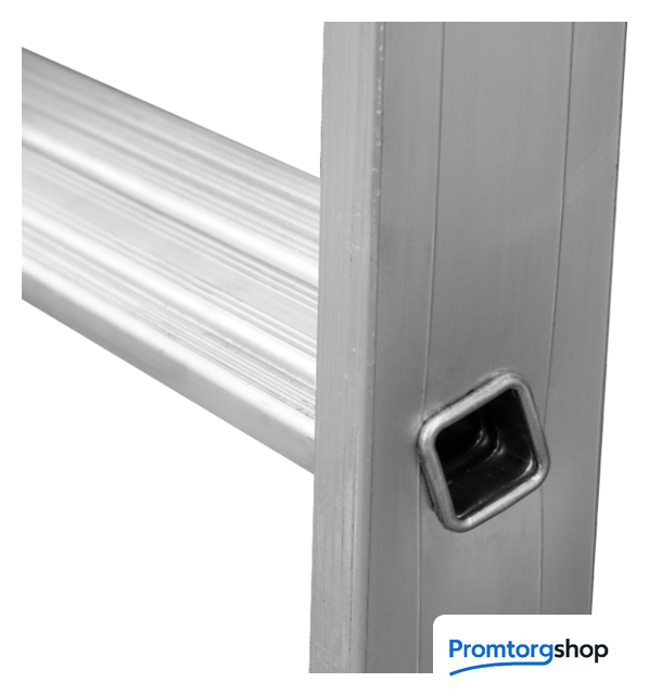 | Тип | приставная лестница. Профессиональная прочная приставная лестница для интенсивного использования. Развальцованные широкие ступени 80 мм увеличивают время работы на высоте. Ширина секции: 400 мм. Развальцованные широкие рифленые ступени 80 мм. Профиль стоек: 72×23 мм. Стойки и ступени из экструдированного алюминиевого профиля. Вальцовочное крепление ступеней. По прочности не уступает сварке. Пластиковые повторяющие рельеф заглушки ступеней с длительным сроком службы скрывают острые кромки. Пластиковые опоры на стену предохраняют поверхность от повреждений. Башмаки из 2х-компонентного пластика с прорезиненной опорой. Большое (15 см²) пятно контакта. Не скользят и не повреждают поверхность. |