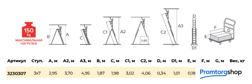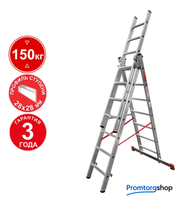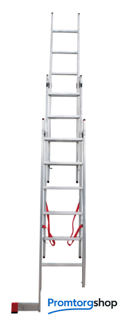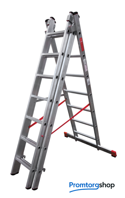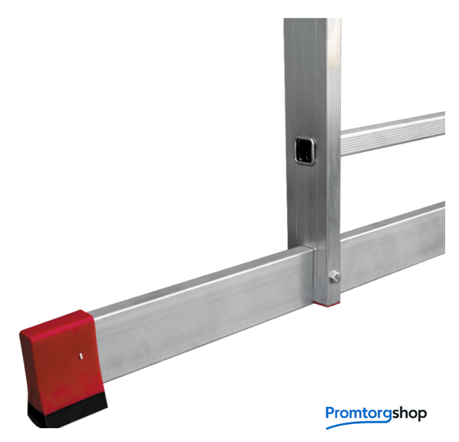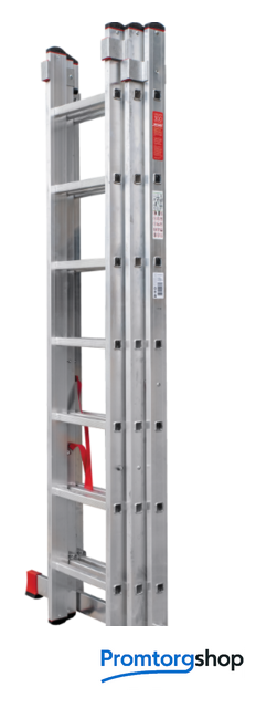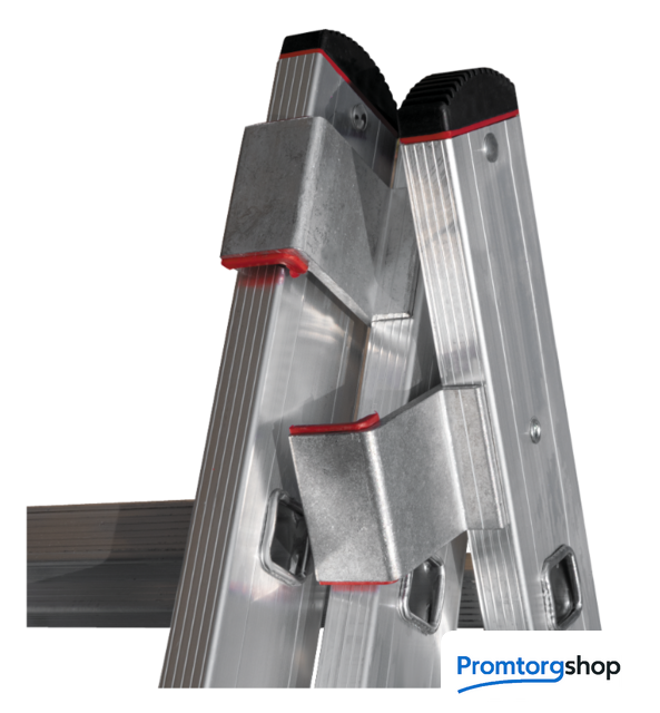 | Тип | лестница секционная, складная, разборная. Профессиональная лестница для ежедневного использования «5 в 1»: приставная лестница, приставная выдвижная двухсекционная лестница, приставная выдвижная трехсекционная лестница, двухсторонняя стремянка, стремянка с выдвижной секцией Ширина верхней секции - 330 мм, ширина нижней секции - 460 мм. Рифлёные перекладины 28x28 мм для надёжного сцепления. Направляющие кронштейны из пресованного алюминевого сплава для надежного удержания выдвижной секции во всех рабочих положениях Рифлёные ступени с шагом 260 мм для безопасного подъёма и спуска Надёжно закреплённые на стойках и траверсе опорные наконечники из двухкомпонентного пластика: жесткий компонент отвечает за надежность крепления, мягкий препятствует скольжению лестницы Широкая поперечная траверса 1000 мм для повышения устойчивости Многократная развальцовка в соединении ступеней со стойками для высокой прочности и долговечности Стойки и ступени изготовлены из прессованного алюминиевого профиля Алюминиевые зацепы с автоматическим фиксатором |
