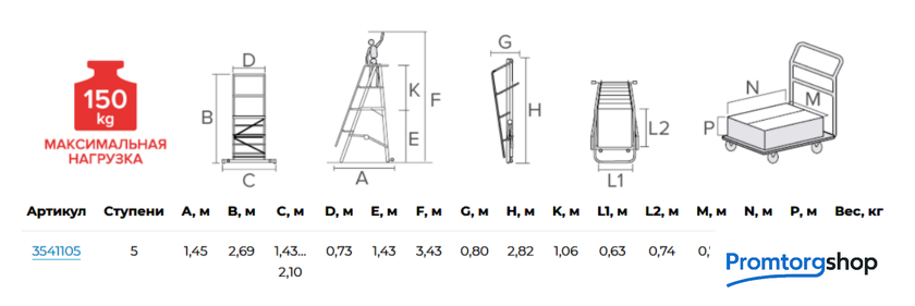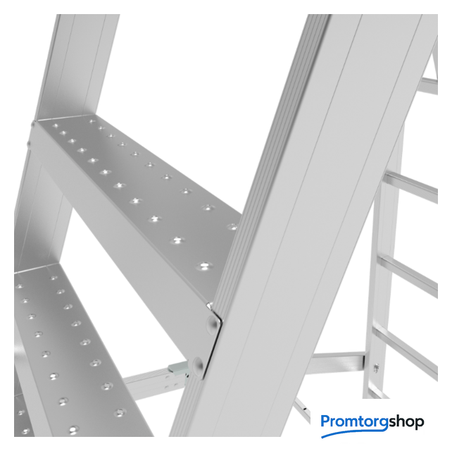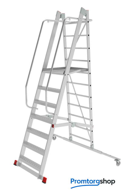 | Тип | лестница передвижная, складная. Профессиональные мобильные подмости для коллективного использования с интенсивными нагрузками снаружи и внутри помещений. Незаменимы для работы на складских стеллажах. Передвижная складная лестница-подмости с площадкой односторонняя предназначена для создания рабочего места на высоте 1,38–3,92 м. Подходит для регулярного использования при профессиональных работах. Идеальна для работы на складских стеллажах. Может применяться внутри и снаружи помещений. Обладает высокой прочностью и долговечностью при лёгком весе (от 42 кг). Соответствует ГОСТ Р58752−2019. Складная конструкция для удобства хранения и транспортировки. Шарнирные замки с автоматической фиксацией в диагональных распорках позволяют легко устанавливать и складывать лестницу. Рабочая площадка 730×620 мм обеспечивает безопасность и удобство при продолжительной работе на высоте. Прочное ограждение высотой 1,1 м с трёх сторон площадки. Подъём оснащён поручнями с двух сторон. Удобные широкие ступени из стали с безопасной кромкой прочно соединены со стойками заклепочным соединением. Глубина ступеней 110 мм. На поверхность ступеней нанесено рифление для устранения скольжения при подъёме. Дополнительные диагональные распорки для жёсткости конструкции. Две жёсткие поперечные траверсы обеспечивают устойчивость лестницы. Одна из траверс телескопическая, с изменяемой длиной для создания максимально широкой площади опоры. Траверсы снабжены колёсными опорами 125×30 мм с тормозами для удобства перемещения и быстрой подготовки к использованию. Практичность и внимание к каждой детали гарантируют безопасность работы на любой высоте. |