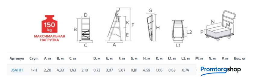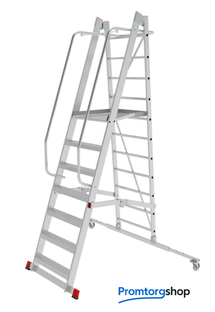 | Тип | лестница передвижная, складная. Лёгкие мобильные подмости для коллективного использования с интенсивными нагрузками снаружи и внутри помещений. Незаменимы для работы на складских стеллажах. Передвижная складная лестница-подмости с площадкой односторонняя предназначена подходит для регулярного использования при профессиональных работах. Идеальна для работы на складских стеллажах. Может применяться внутри и снаружи помещений. Обладает высокой прочностью и долговечностью при лёгком весе (от 42 кг). Соответствует ГОСТ Р58752−2019. Складная конструкция для удобства хранения и транспортировки. Шарнирные замки с автоматической фиксацией в диагональных распорках позволяют легко устанавливать и складывать лестницу. Рабочая площадка 730×620 мм обеспечивает безопасность и удобство при продолжительной работе на высоте. Прочное ограждение высотой 1,1 м с трёх сторон площадки. Подъём оснащён поручнями с двух сторон. Удобные широкие ступени из стали с безопасной кромкой прочно соединены со стойками заклепочным соединением. Глубина ступеней 110 мм. На поверхность ступеней нанесено рифление для устранения скольжения при подъёме. Дополнительные диагональные распорки для жёсткости конструкции. Две жёсткие поперечные траверсы обеспечивают устойчивость лестницы. Одна из траверс телескопическая, с изменяемой длиной для создания максимально широкой площади опоры. Траверсы снабжены колёсными опорами 125×30 мм с тормозами для удобства перемещения и быстрой подготовки к использованию. Практичность и внимание к каждой детали гарантируют безопасность работы на любой высоте. Страна производства: Россия |