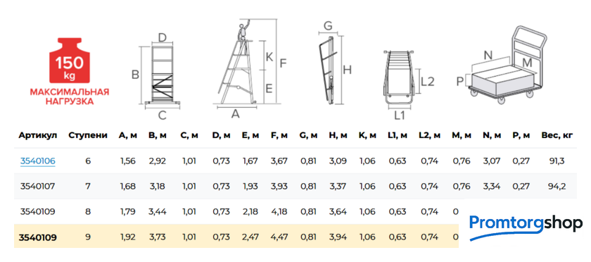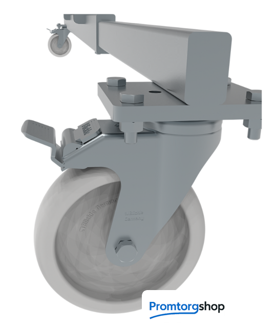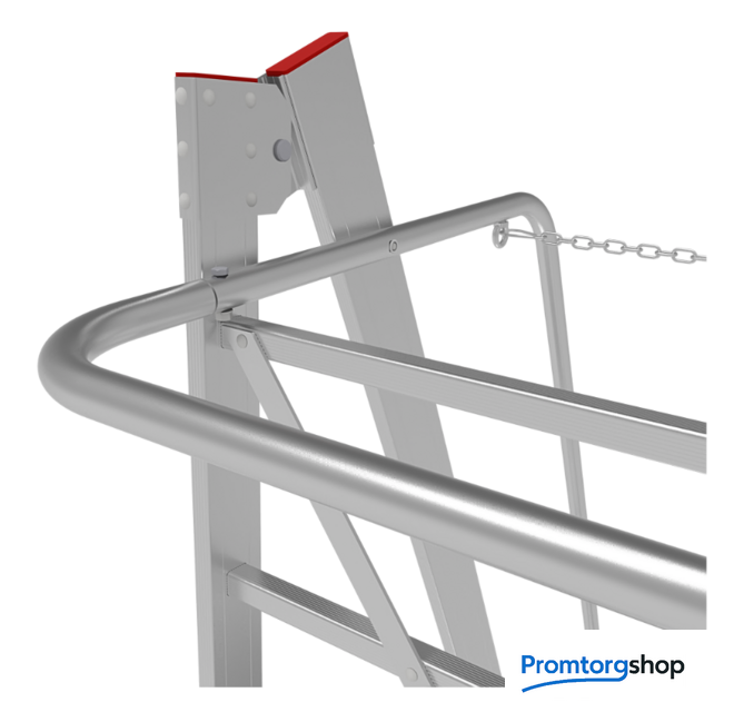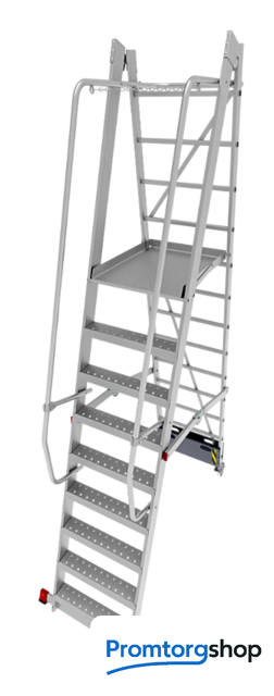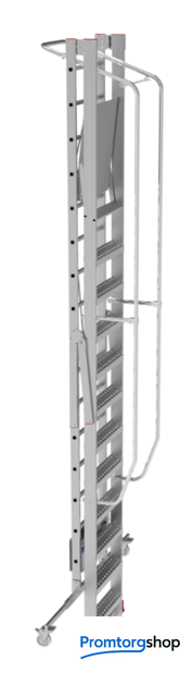 | Тип | мобильные подмости , неразборная. Профессиональные мобильные подмости для коллективного использования с интенсивными нагрузками снаружи и внутри помещений. Незаменимы для работы на складских стеллажах. Большая рабочая площадка 730×620 мм с поднятыми бортами. Пространство для поворота и боковых перемещений. Трёхстороннее ограждение площадки (перила) и страховочная цепь с карабином на входе. Точка опоры на высоте. Поручни по обеим сторонам лестницы для безопасного подъёма и спуска. Рифленые стальные ступени 110 мм для надёжного сцепления. Шарнирные замки с автоматической фиксацией регулируются одной рукой. Широкая усиленная телескопическая опорная траверса стабилизирует лестницу (в комплекте 1×10–1×12). Массивный балласт и диагональные алюминиевые стабилизаторы создают жёсткую рамную конструкцию. 2 поворотных колёсных опоры 125×30 мм с фиксацией угла поворота и тормозом. Башмаки траверсы из 2х-компонентного пластика с прорезиненной опорой. Не скользят и не повреждают поверхность. |