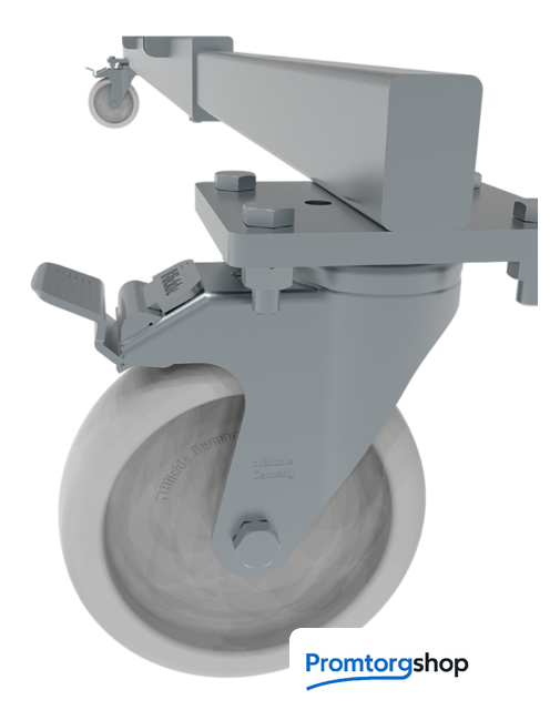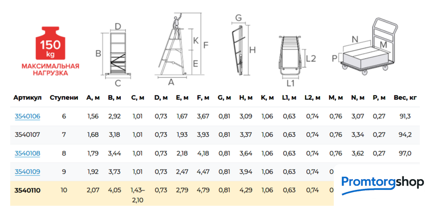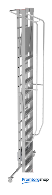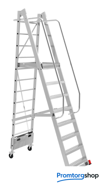 | Тип | мобильные подмости , неразборная. Профессиональные мобильные подмости для коллективного использования с интенсивными нагрузками снаружи и внутри помещений. Незаменимы для работы на складских стеллажах. Большая рабочая площадка 730×620 мм с поднятыми бортами. Пространство для поворота и боковых перемещений. Трёхстороннее ограждение площадки (перила) и страховочная цепь с карабином на входе. Точка опоры на высоте. Поручни по обеим сторонам лестницы для безопасного подъёма и спуска. Рифленые стальные ступени 110 мм для надёжного сцепления. Шарнирные замки с автоматической фиксацией регулируются одной рукой. Широкая усиленная телескопическая опорная траверса стабилизирует лестницу (в комплекте 1×10–1×12). Массивный балласт и диагональные алюминиевые стабилизаторы создают жёсткую рамную конструкцию. 2 поворотных колёсных опоры 125×30 мм с фиксацией угла поворота и тормозом. Башмаки траверсы из 2х-компонентного пластика с прорезиненной опорой. Не скользят и не повреждают поверхность. |