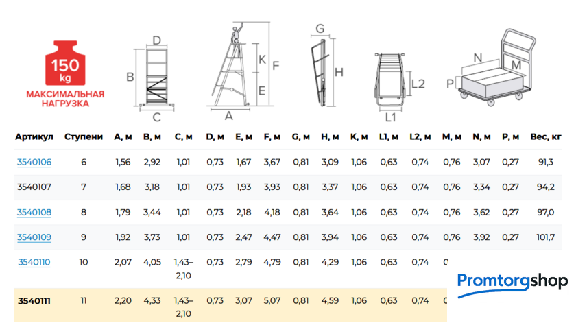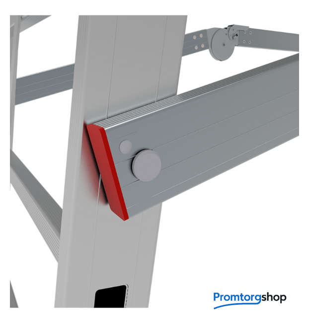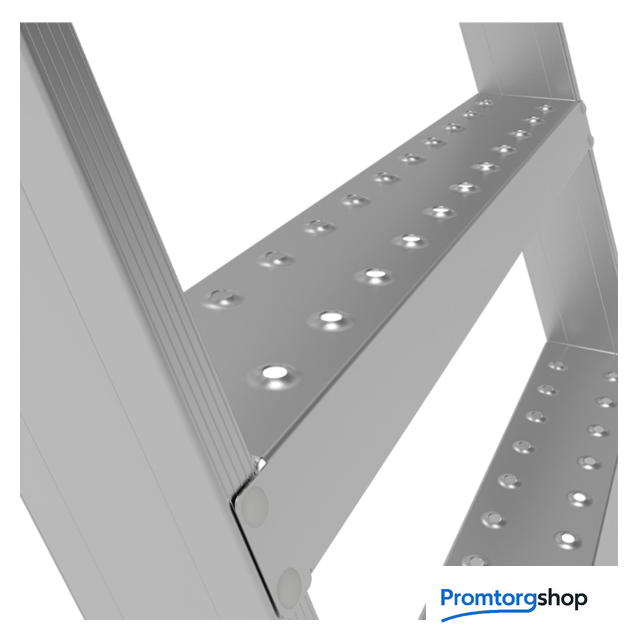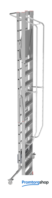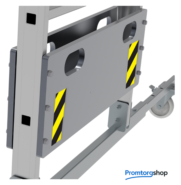 | Тип | мобильные подмости , неразборная. Профессиональные мобильные подмости для коллективного использования с интенсивными нагрузками снаружи и внутри помещений. Незаменимы для работы на складских стеллажах. Большая рабочая площадка 730×620 мм с поднятыми бортами. Пространство для поворота и боковых перемещений. Трёхстороннее ограждение площадки (перила) и страховочная цепь с карабином на входе. Точка опоры на высоте. Поручни по обеим сторонам лестницы для безопасного подъёма и спуска. Рифленые стальные ступени 110 мм для надёжного сцепления. Шарнирные замки с автоматической фиксацией регулируются одной рукой. Широкая усиленная телескопическая опорная траверса стабилизирует лестницу (в комплекте 1×10–1×12). Массивный балласт и диагональные алюминиевые стабилизаторы создают жёсткую рамную конструкцию. 2 поворотных колёсных опоры 125×30 мм с фиксацией угла поворота и тормозом. Башмаки траверсы из 2х-компонентного пластика с прорезиненной опорой. Не скользят и не повреждают поверхность. |
