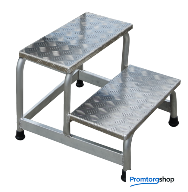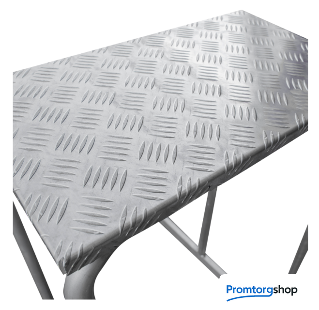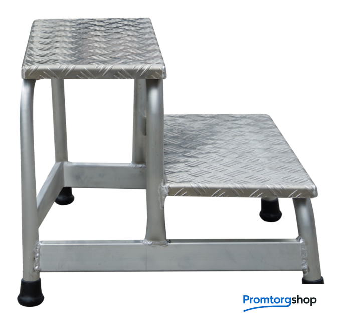 | Тип | монтажная подставка, неразборная. Профессиональная подставка с широкими нескользящими ступенями для строительных работ с интенсивными нагрузками. Устойчивая сварная конструкция из прочных алюминиевых труб. Рабочая площадка 520×305 мм. Пространство для поворота и боковых перемещений. Широкие ступени — площадки 240 мм из рифлёного алюминиевого листа для надёжного сцепления. Башмаки стоек-опор из прочного пластика. Не скользят и не повреждают поверхность. |