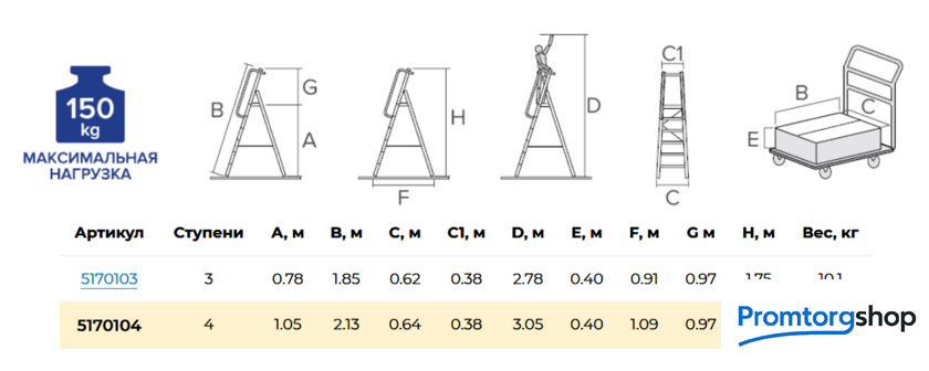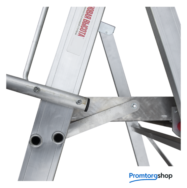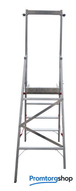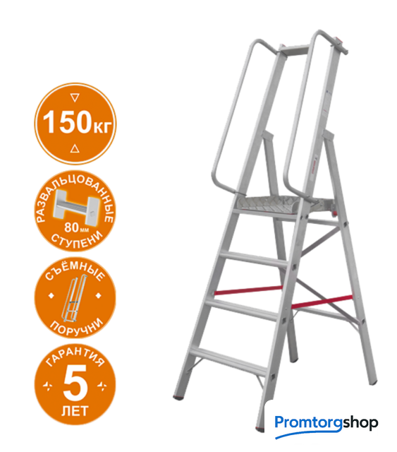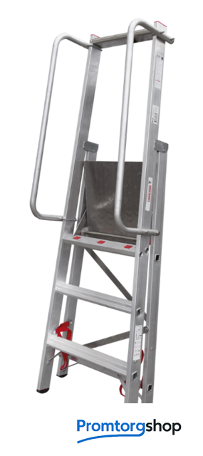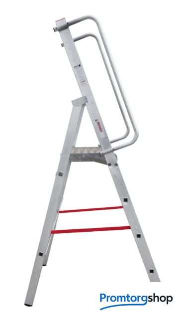 | Тип | лестница-стремянка, складная, неразборная. Индустриальная стремянка с ограждением, широкой площадкой и развальцованными ступенями для интенсивной длительной эксплуатации Рабочая площадка 400x400 мм с поднятыми бортами 60 мм. Большая площадка увеличивает радиус работы. Съемные поручни с двух сторон лестничного подъёма. Усиленный профиль стоек с рёбрами жёсткости. Рифлёные развальцованные ступени 80 мм (евростандарт). Развальцованное соединение ступеней не уступает по прочности сварке. Безопасная конструкция механизма складывания. Обеспечивает удобство хранения и транспортировки. Дополнительные поперечные распорки для повышения жёсткости конструкции. Соответствует ГОСТ Р 58753-2019. Страховочные ремни с усиленными стальными крепёжными петлями. |