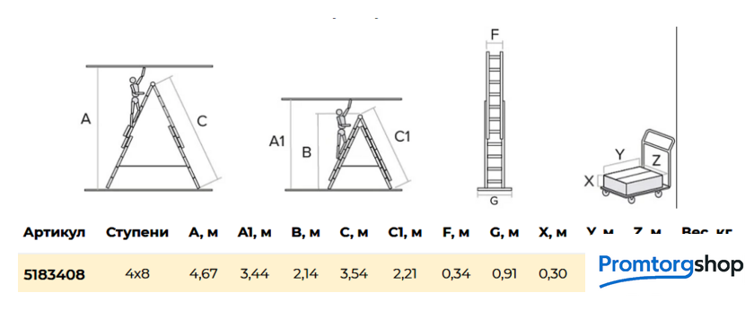 | Тип | лестница секционная, складная. Индустриальная двухсторонняя стремянка. Изменяемая рабочая высота и возможность установки на разноуровневой поверхности. Для регулярного коллективного использования с интенсивными нагрузками. Описание: Легкая регулировка высоты вручную с шагом 260 мм (одна перекладина). Регулировка высоты между перекладинами с обеих сторон. Надежная фиксация в рабочем положении при помощи стальных крюков с защитой от складывания. Прочные направляющие кронштейны из алюминия на винтовом соединении. Зацепы для фиксации выдвижных секций на нужном шаге. Увеличенные рифлёные развальцованные перекладины 28х28 мм для надежного сцепления. Вальцовочное крепление перекладин по прочности не уступает сварке. Страховочные погодоустойчивые ремни со вшитыми стальными крепёжными петлями. Специальный закрепочный шов не позволяющий ремням распускаться. Ремни не перетираются благодаря стальным петлям специальной геометрии. Благодаря сквозным заклепкам петли не вырываются. 2 широкие съёмные опорные траверсы стабилизируют конструкцию. Башмаки из 2х-компонентного пластика с прорезиненной опорой. Не скользят и не повреждают поверхность. |