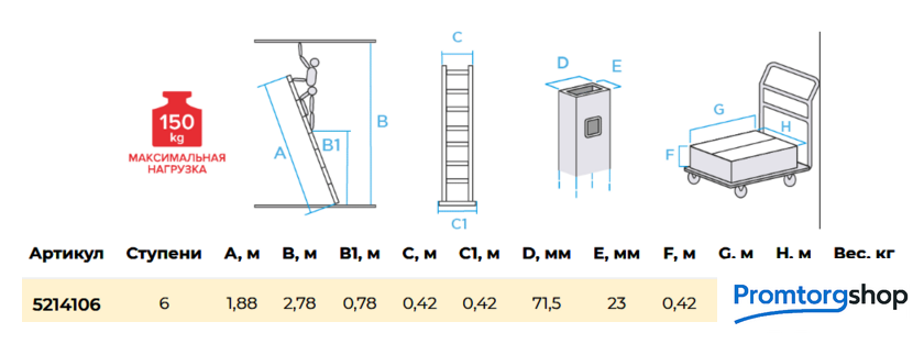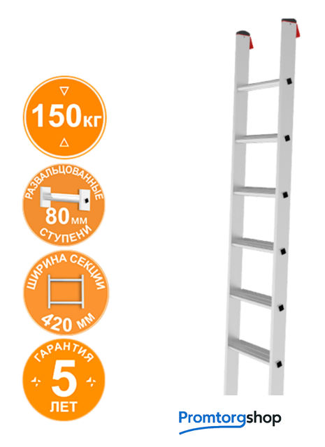 | Тип | приставная лестница, неразборная. Индустриальная прочная приставная лестница для интенсивного использования. Развальцованные широкие ступени 80 мм увеличивают время работы на высоте. Ширина секции: 420 мм. Развальцованные широкие рифленые ступени 80 мм. Профиль стоек: 72×23 мм. Вальцовочное крепление ступеней. По прочности не уступает сварке. Пластиковые опоры на стену предохраняют поверхность от повреждений. Башмаки стоек сверху и снизу лестницы и траверсы из 2х-компонентного пластика с прорезиненной опорой. Не скользят и не повреждают поверхность. |