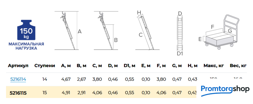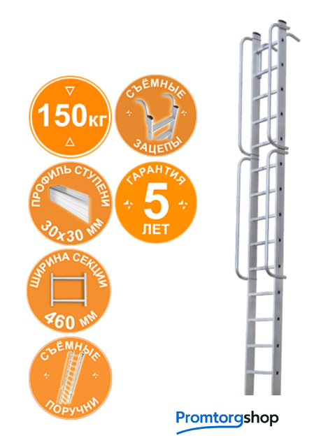 | Тип | лестница-стремянка, неразборная. Индустриальная высокопрочная лестница со съёмными поручнями и зацепами для интенсивного использования увеличенной ширины 460 мм. Съёмные зацепы для крепления за элементы конструкций при проведении высотных работ. Съёмные поручни по обеим сторонам лестницы для безопасного подъёма и спуска. Увеличенная ширина 460 мм для удобства и устойчивости Увеличенные рифлёные перекладины 30×30 мм для надёжного сцепления. Вальцовочное крепление перекладин. По прочности не уступает сварке. Башмаки стоек из 2х-компонентного пластика с прорезиненной опорой сверху и снизу лестницы. Не скользят и не повреждают поверхность. |