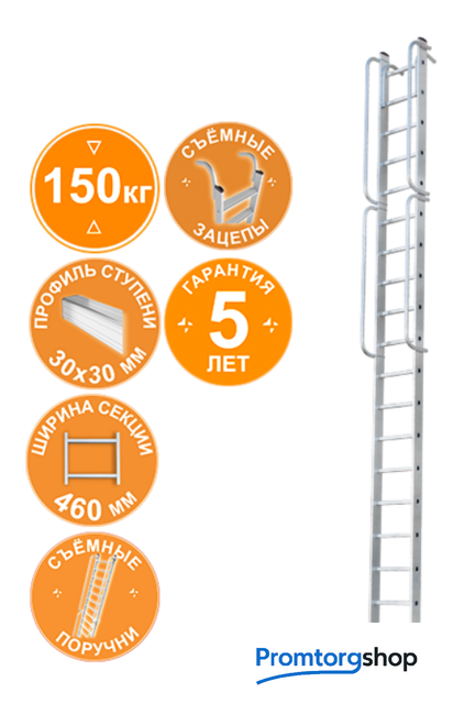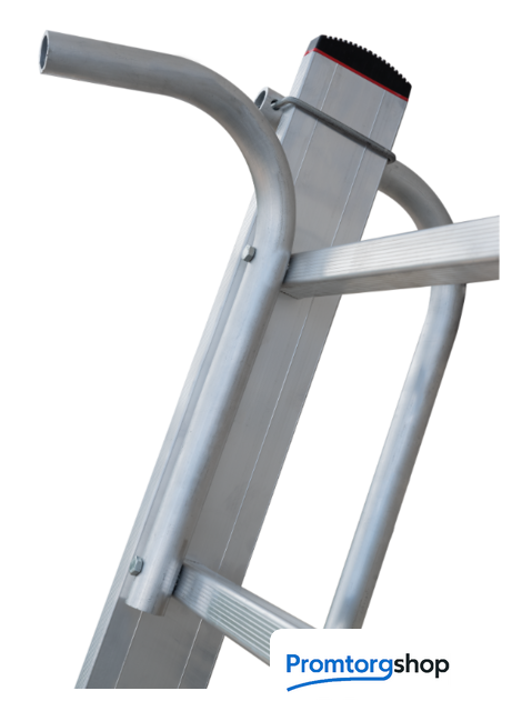 | Тип | лестница-стремянка, неразборная. Индустриальная высокопрочная лестница со съёмными поручнями и зацепами для интенсивного использования увеличенной ширины 460 мм. Съёмные зацепы для крепления за элементы конструкций при проведении высотных работ. Съёмные поручни по обеим сторонам лестницы для безопасного подъёма и спуска. Увеличенная ширина 460 мм для удобства и устойчивости Увеличенные рифлёные перекладины 30×30 мм для надёжного сцепления. Вальцовочное крепление перекладин. По прочности не уступает сварке. Башмаки стоек из 2х-компонентного пластика с прорезиненной опорой сверху и снизу лестницы. Не скользят и не повреждают поверхность. |