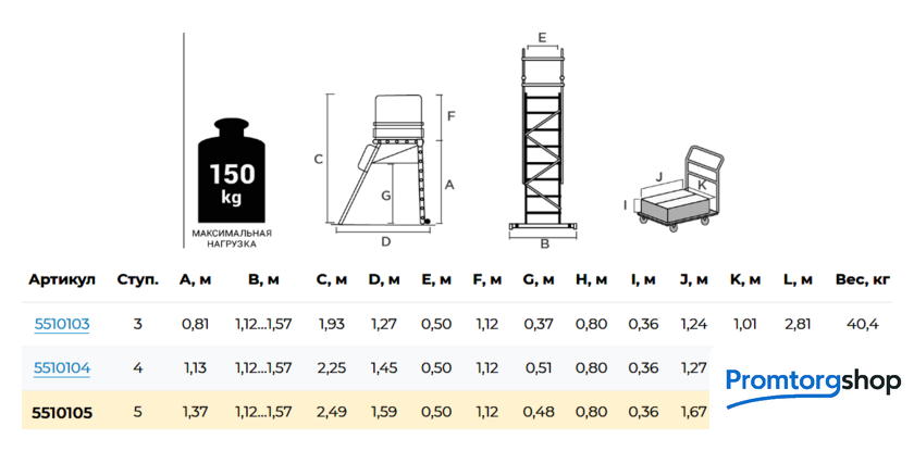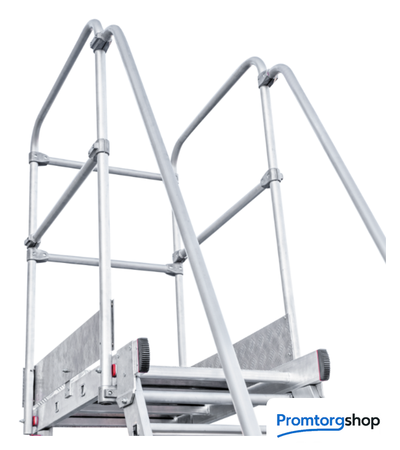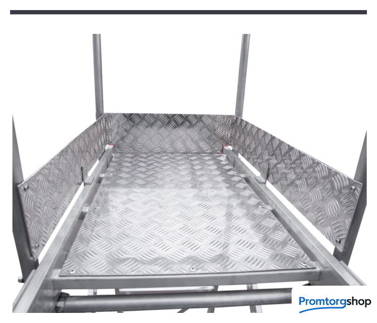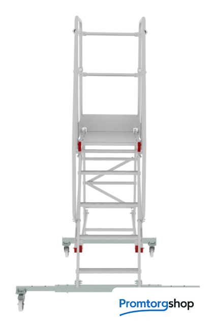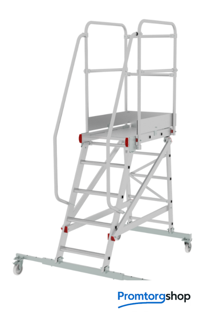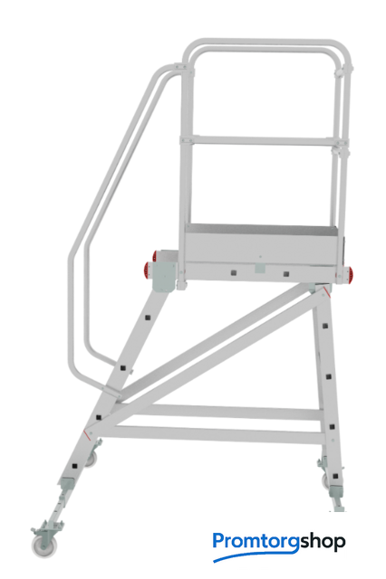 | Тип | лестница передвижная. Индустриальные мобильные подмости для коллективного использования с интенсивными нагрузками снаружи и внутри помещений. Для регулярного использования при профессиональных работах. Соответствует ГОСТ Р58752-2019. Идеальна для работы на складских стеллажах. Большая рабочая площадка 800x500 мм. Пространство для поворота и боковых перемещений. Прочное ограждение (перила) высотой 1,1 м с трёх сторон площадки с планками на уровне коленей и высоким плинтусом. 4 поворотных колёсных опоры 125x30 мм с фиксацией угла поворота и тормозом. Продольные и диагональные стабилизаторы создают жёсткую рамную конструкцию. Широкие опорные траверсы стабилизируют лестницу. Одна из траверс телескопическая, с изменяемой длиной для создания максимально широкой площади опоры. Рифлёные развальцованные ступени 80 мм (евростандарт) с жёстким алюминиевым профилем в основании для надёжного сцепления. Поручни по обеим сторонам лестницы для безопасного подъёма и спуска. Вальцовочное крепление ступеней. По прочности не уступает сварке. |