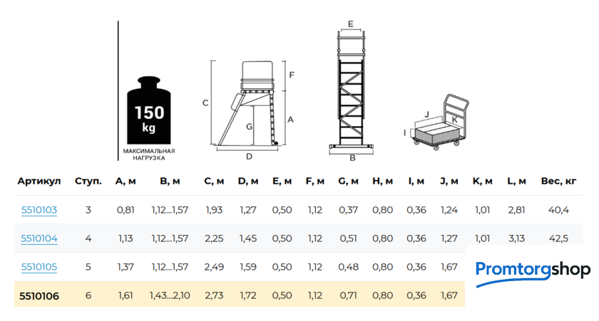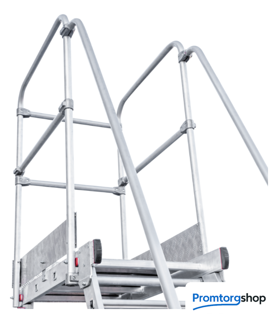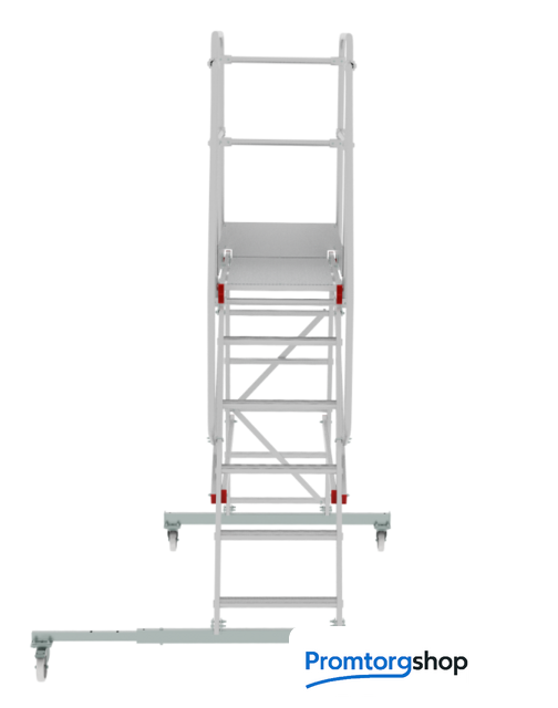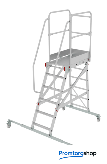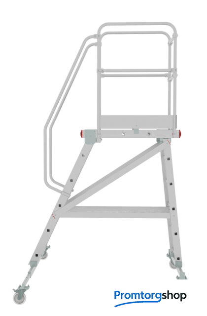 | Тип | лестница передвижная, неразборная. Индустриальные мобильные подмости для коллективного использования с интенсивными нагрузками снаружи и внутри помещений. Для регулярного использования при профессиональных работах. Соответствует ГОСТ Р58752-2019. Идеальна для работы на складских стеллажах. Большая рабочая площадка 800x500 мм. Пространство для поворота и боковых перемещений. Прочное ограждение (перила) высотой 1,1 м с трёх сторон площадки с планками на уровне коленей и высоким плинтусом. 4 поворотных колёсных опоры 125x30 мм с фиксацией угла поворота и тормозом. Продольные и диагональные стабилизаторы создают жёсткую рамную конструкцию. Широкие опорные траверсы стабилизируют лестницу. Одна из траверс телескопическая, с изменяемой длиной для создания максимально широкой площади опоры. Рифлёные развальцованные ступени 80 мм (евростандарт) с жёстким алюминиевым профилем в основании для надёжного сцепления. Поручни по обеим сторонам лестницы для безопасного подъёма и спуска. Вальцовочное крепление ступеней. По прочности не уступает сварке. |