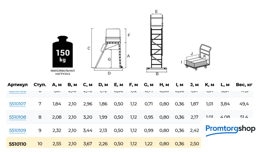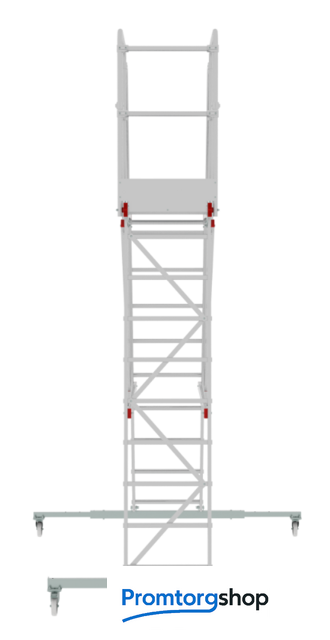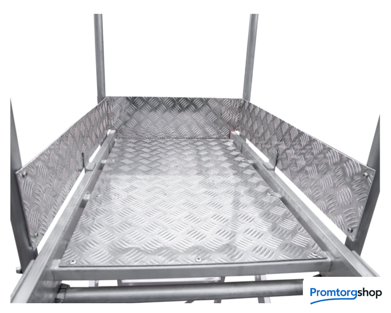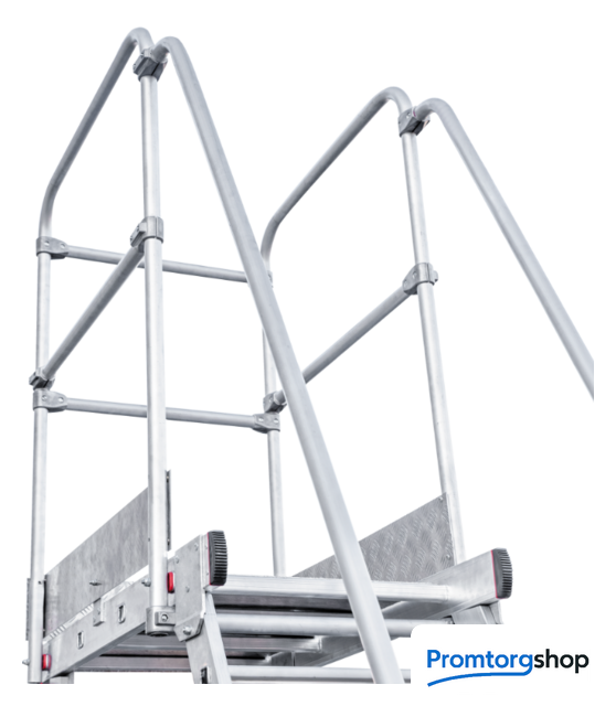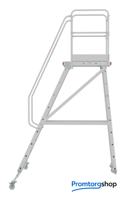 | Тип | мобильные подмости неразборная. Индустриальные мобильные подмости для коллективного использования с интенсивными нагрузками снаружи и внутри помещений. Для регулярного использования при профессиональных работах. Соответствует ГОСТ Р58752-2019. Идеальна для работы на складских стеллажах. Большая рабочая площадка 800x500 мм. Пространство для поворота и боковых перемещений. Прочное ограждение (перила) высотой 1,1 м с трёх сторон площадки с планками на уровне коленей и высоким плинтусом. 4 поворотных колёсных опоры 125x30 мм с фиксацией угла поворота и тормозом. Продольные и диагональные стабилизаторы создают жёсткую рамную конструкцию. Широкие опорные траверсы стабилизируют лестницу. Одна из траверс телескопическая, с изменяемой длиной для создания максимально широкой площади опоры. Рифлёные развальцованные ступени 80 мм (евростандарт) с жёстким алюминиевым профилем в основании для надёжного сцепления. Поручни по обеим сторонам лестницы для безопасного подъёма и спуска. Вальцовочное крепление ступеней. По прочности не уступает сварке. |