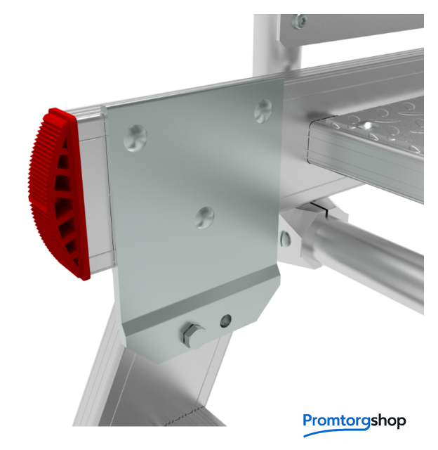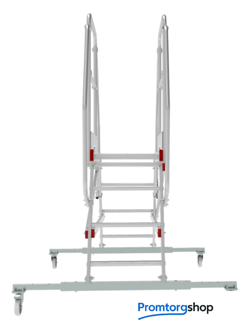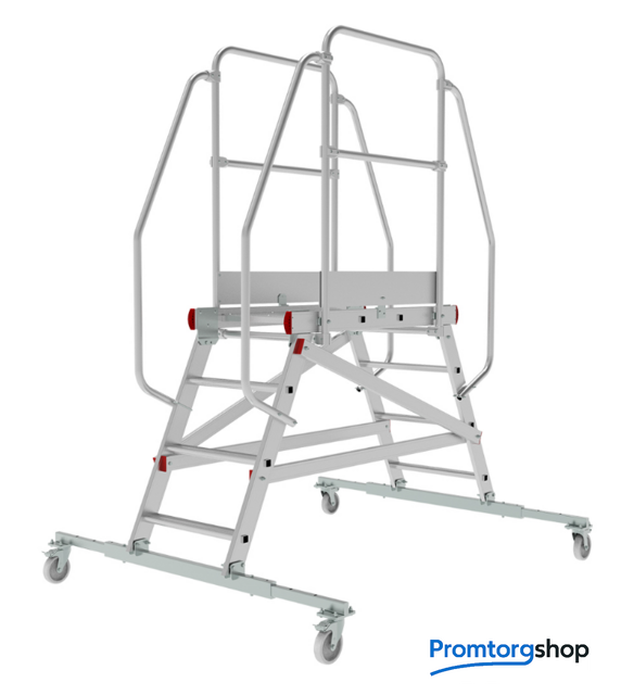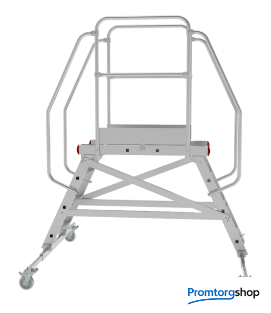 | Тип | лестница-помост, неразборная. Индустриальная передвижная лестница-подмости с площадкой двухсторонняя предназначена для создания рабочего места на высоте. Предназначена для регулярного интенсивного использования при профессиональных работах. Передвижная лестница-подмости с площадкой двухсторонняя предназначена для создания рабочего места на высоте. Соответствует ГОСТ Р58752−2019. Рабочая площадка 800×500 мм обеспечивает безопасность и удобство при продолжительной работе на высоте. Максимальная рабочая поверхность и устойчивость при работе на площадке. Двухсторонний подъём обеспечивает высокую степень универсальности при подъёме и спуске. Прочное ограждение высотой 1,1 м с планками на уровне коленей и дополнительным барьером на уровне ступней по обеим сторонам площадки. Подъём оснащён поручнями с двух сторон. Удобные широкие ступени с безопасной кромкой прочно соединены со стойками 32-кратным вальцованным соединением. Дополнительную жесткость конструкции обеспечивают продольные и диагональные распорки. Глубина ступеней 80 мм. На поверхность ступеней нанесено рифление для устранения скольжения при подъёме. Две жёсткие поперечные траверсы обеспечивают устойчивость лестницы. Траверсы телескопические, с изменяемой длиной для создания максимально широкой площади опоры. Траверсы снабжены колёсными опорами 125×30 мм с тормозами для удобства перемещения и быстрой подготовки к использованию. |