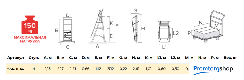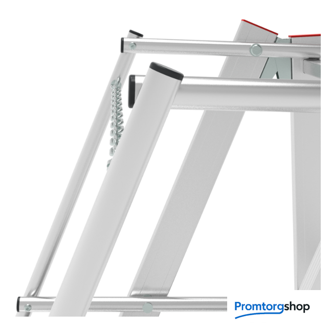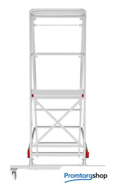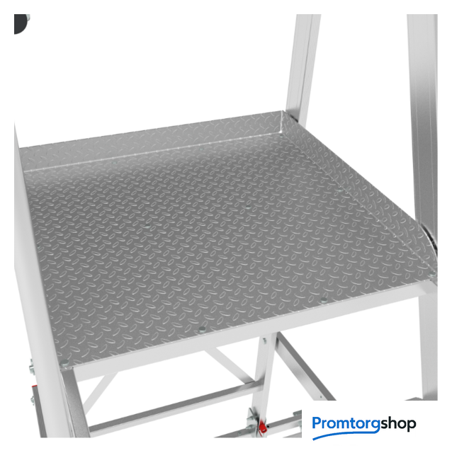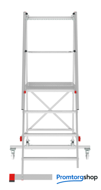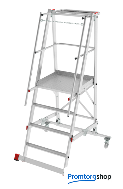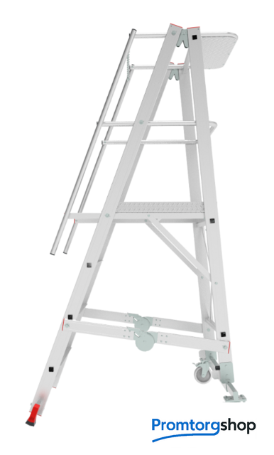 | Тип | лестница передвижная, складная. Индустриальные мобильные складные подмости для коллективного использования с интенсивными нагрузками снаружи и внутри помещений. Незаменимы для работы на складских стеллажах. Большая рабочая площадка 600x500 мм. Пространство для поворота и боковых перемещений. Трёхстороннее ограждение площадки (перила) и страховочная цепь на входе. Точка опоры на высоте. Поручни по обеим сторонам лестницы для безопасного подъёма и спуска. Рифлёные развальцованные ступени 80 мм (евростандарт) с жёстким алюминиевым профилем в основании для надёжного сцепления. Вальцовочное крепление ступеней. По прочности не уступает сварке. Компактно складывается для хранения и транспортировки. В сложенном состоянии занимает мало места. Шарнирные замки с автоматической фиксацией регулируются одной рукой. 2 поворотных колёсных опоры 125x30 мм с фиксацией угла поворота и тормозом. Широкие опорные траверсы стабилизируют лестницу. Одна из траверс телескопическая, с изменяемой длиной для создания максимально широкой площади опоры. Башмаки траверсы из 2х-компонентного пластика с прорезиненной опорой. Не скользят и не повреждают поверхность. |