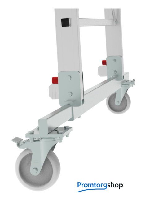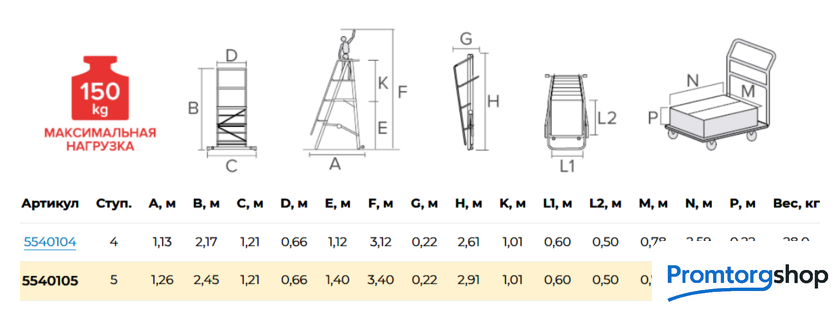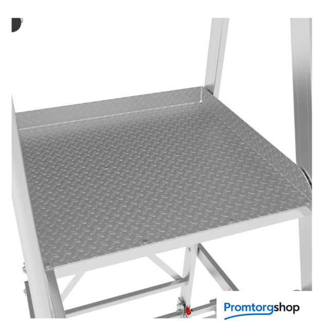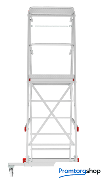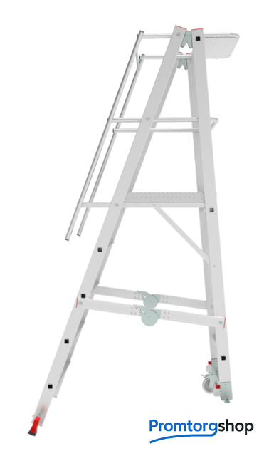 | Тип | лестница передвижная, складная. Мобильные складные подмости для коллективного использования с интенсивными нагрузками снаружи и внутри помещений. Незаменимы для работы на складских стеллажах. Большая рабочая площадка 600×500 мм. Пространство для поворота и боковых перемещений. Трехстороннее ограждение площадки (перила) и страховочная цепь на входе. Точка опоры на высоте. Поручни по обеим сторонам лестницы для безопасного подъема и спуска. Рифленые развальцованные ступени 80 мм (евростандарт) с жестким алюминиевым профилем в основании для надежного сцепления. Вальцовочное крепление ступеней. По прочности не уступает сварке. Компактно складывается для хранения и транспортировки. В сложенном состоянии занимает мало места. Шарнирные замки с автоматической фиксацией регулируются одной рукой. 2 поворотных колесных опоры 125×30 мм с фиксацией угла поворота и тормозом. Широкие опорные траверсы стабилизируют лестницу. Одна из траверс телескопическая, с изменяемой длиной для создания максимально широкой площади опоры. Башмаки траверсы из 2х-компонентного пластика с прорезиненной опорой. Не скользят и не повреждают поверхность. Страна производства: Россия |