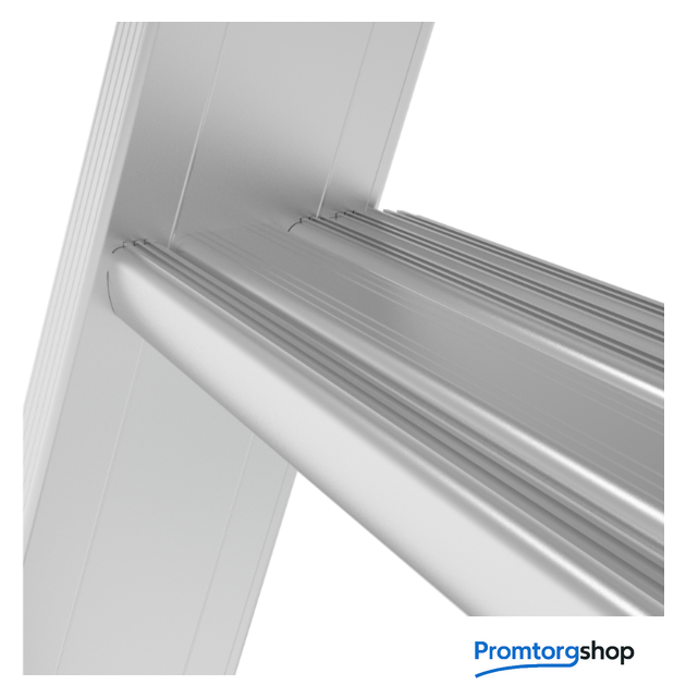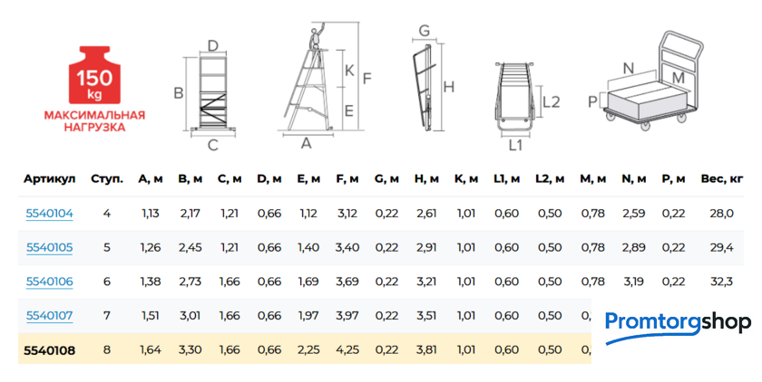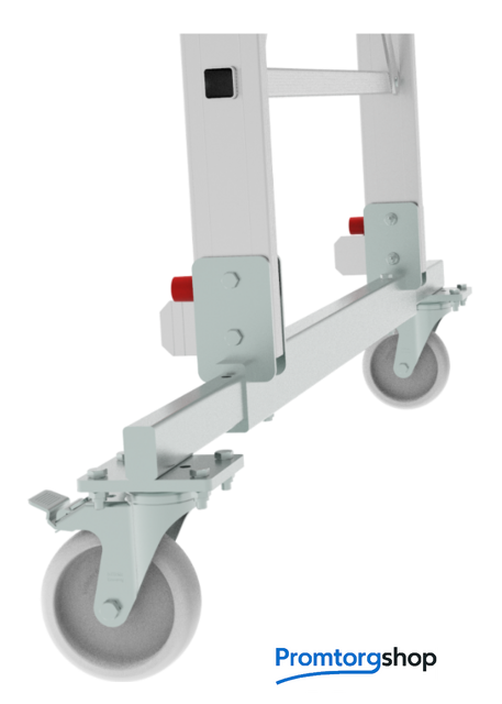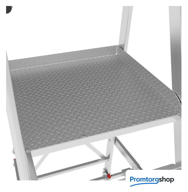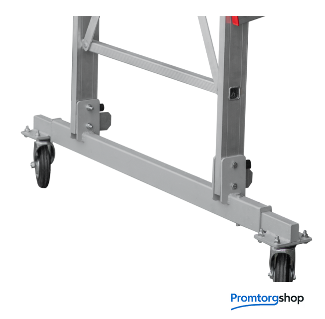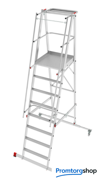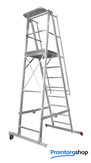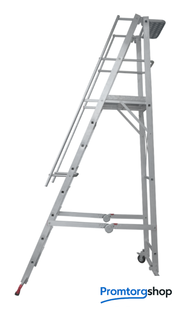 | Тип | лестница передвижная, складная. Мобильные складные подмости для коллективного использования с интенсивными нагрузками снаружи и внутри помещений. Незаменимы для работы на складских стеллажах. Большая рабочая площадка 600×500 мм. Пространство для поворота и боковых перемещений. Трехстороннее ограждение площадки (перила) и страховочная цепь на входе. Точка опоры на высоте. Поручни по обеим сторонам лестницы для безопасного подъема и спуска. Рифленые развальцованные ступени 80 мм (евростандарт) с жестким алюминиевым профилем в основании для надежного сцепления. Вальцовочное крепление ступеней. По прочности не уступает сварке. Компактно складывается для хранения и транспортировки. В сложенном состоянии занимает мало места. Шарнирные замки с автоматической фиксацией регулируются одной рукой. 2 поворотных колесных опоры 125×30 мм с фиксацией угла поворота и тормозом. Широкие опорные траверсы стабилизируют лестницу. Одна из траверс телескопическая, с изменяемой длиной для создания максимально широкой площади опоры. Башмаки траверсы из 2х-компонентного пластика с прорезиненной опорой. Не скользят и не повреждают поверхность. Страна производства: Россия |