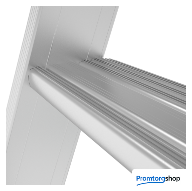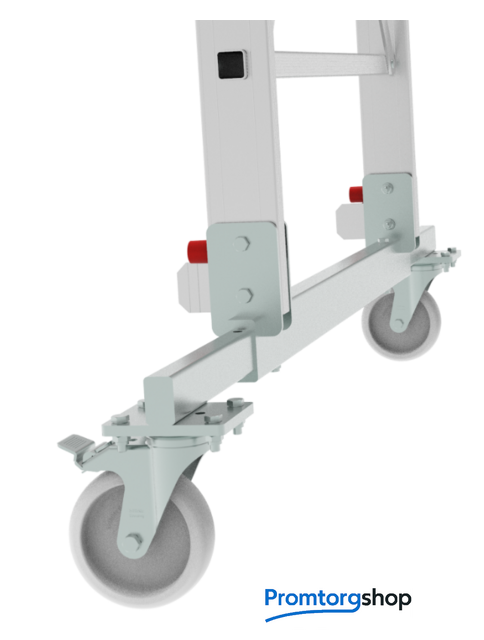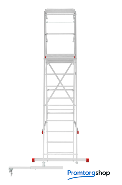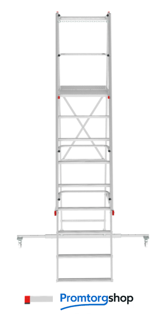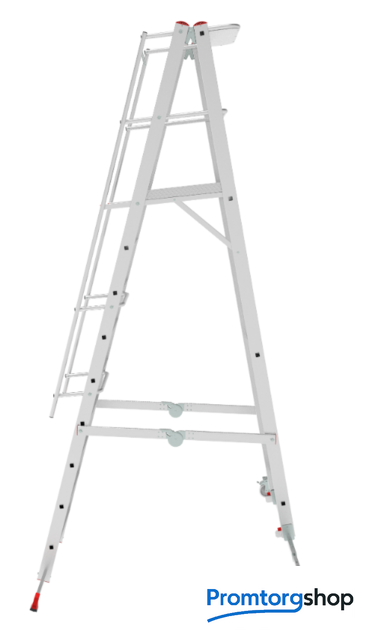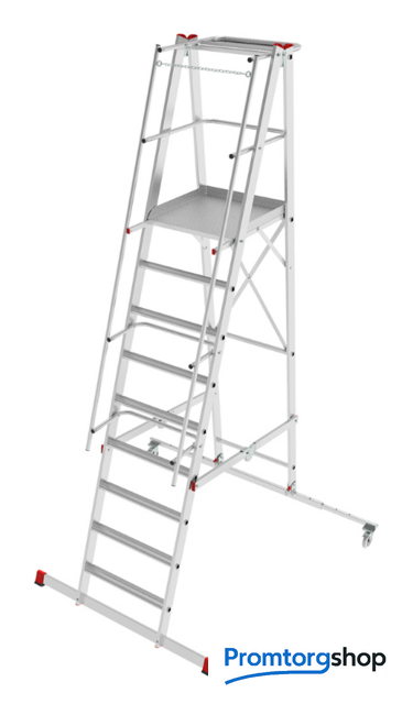 | Тип | лестница передвижная, складная. Индустриальные мобильные складные подмости для коллективного использования с интенсивными нагрузками снаружи и внутри помещений. Незаменимы для работы на складских стеллажах. Большая рабочая площадка 600x500 мм. Пространство для поворота и боковых перемещений. Трёхстороннее ограждение площадки (перила) и страховочная цепь на входе. Точка опоры на высоте. Поручни по обеим сторонам лестницы для безопасного подъёма и спуска. Рифлёные развальцованные ступени 80 мм (евростандарт) с жёстким алюминиевым профилем в основании для надёжного сцепления. Вальцовочное крепление ступеней. По прочности не уступает сварке. Компактно складывается для хранения и транспортировки. В сложенном состоянии занимает мало места. Шарнирные замки с автоматической фиксацией регулируются одной рукой. 2 поворотных колёсных опоры 125x30 мм с фиксацией угла поворота и тормозом. Широкие опорные траверсы стабилизируют лестницу. Одна из траверс телескопическая, с изменяемой длиной для создания максимально широкой площади опоры. Башмаки траверсы из 2х-компонентного пластика с прорезиненной опорой. Не скользят и не повреждают поверхность. Страна производства: Россия |