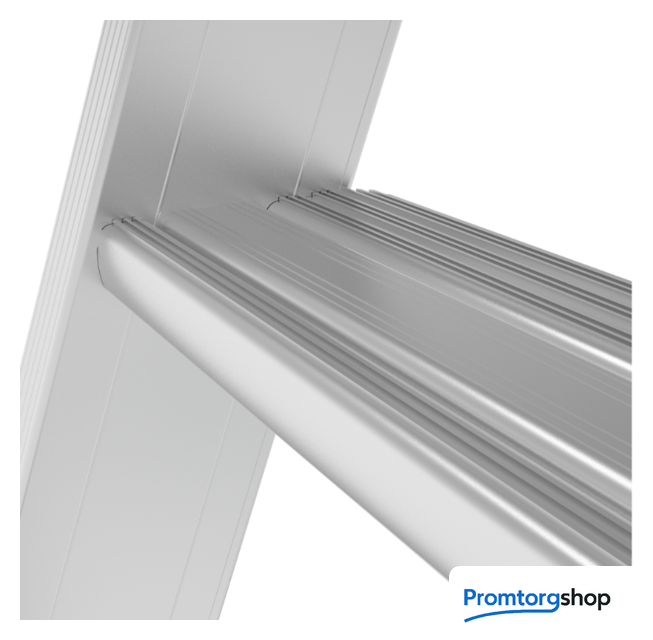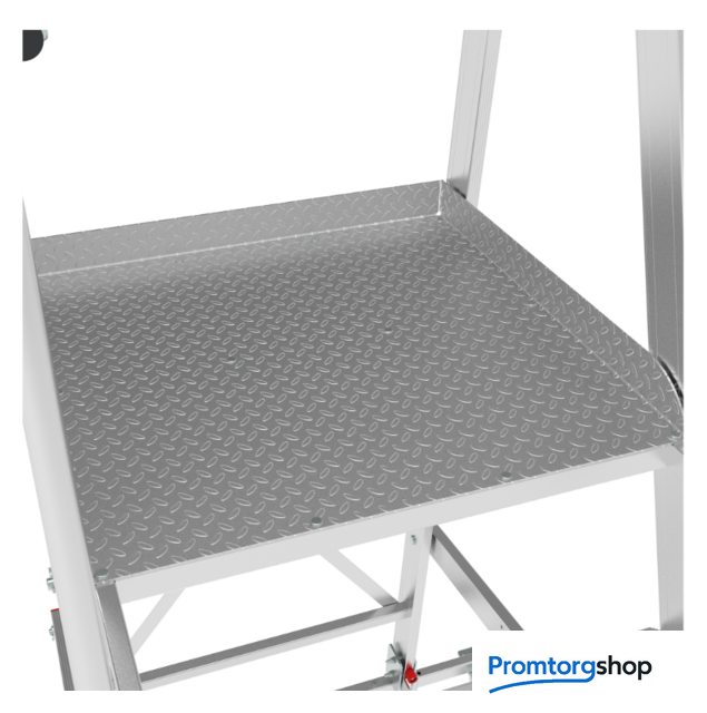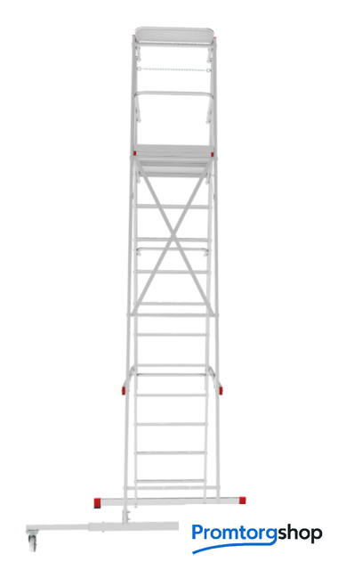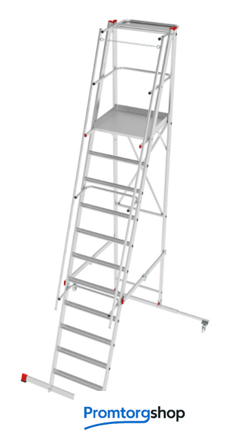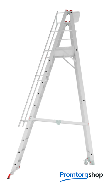 | Тип | лестница передвижная, складная. Мобильные складные подмости для коллективного использования с интенсивными нагрузками снаружи и внутри помещений. Незаменимы для работы на складских стеллажах. Большая рабочая площадка 600×500 мм. Пространство для поворота и боковых перемещений. Трехстороннее ограждение площадки (перила) и страховочная цепь на входе. Точка опоры на высоте. Поручни по обеим сторонам лестницы для безопасного подъема и спуска. Рифленые развальцованные ступени 80 мм (евростандарт) с жестким алюминиевым профилем в основании для надежного сцепления. Вальцовочное крепление ступеней. По прочности не уступает сварке. Компактно складывается для хранения и транспортировки. В сложенном состоянии занимает мало места. Шарнирные замки с автоматической фиксацией регулируются одной рукой. 2 поворотных колесных опоры 125×30 мм с фиксацией угла поворота и тормозом. Широкие опорные траверсы стабилизируют лестницу. Одна из траверс телескопическая, с изменяемой длиной для создания максимально широкой площади опоры. Башмаки траверсы из 2х-компонентного пластика с прорезиненной опорой. Не скользят и не повреждают поверхность. Страна производства: Россия |
