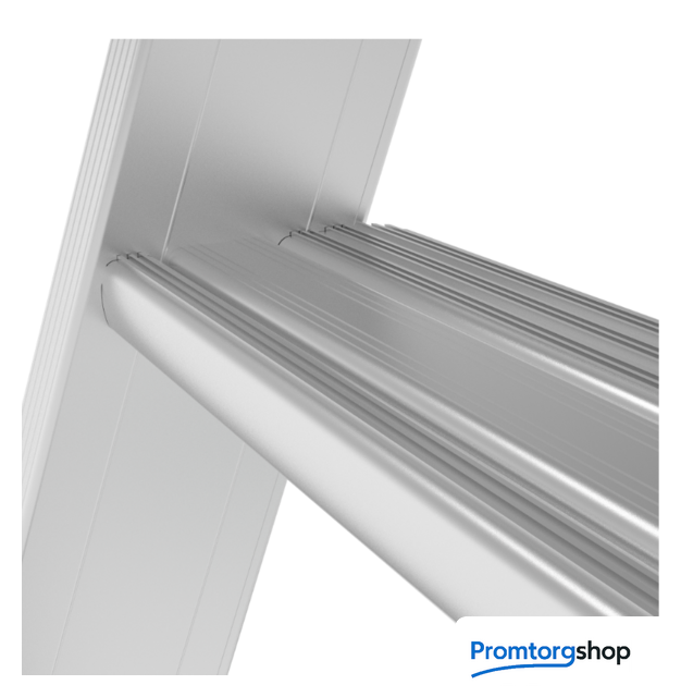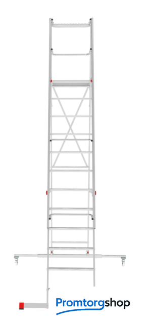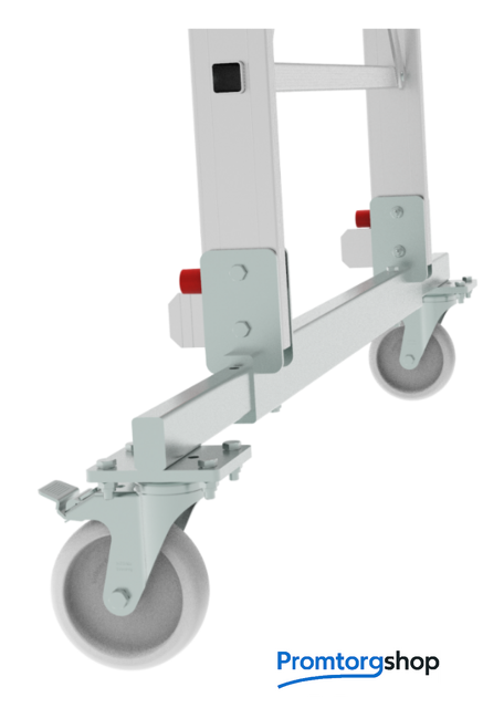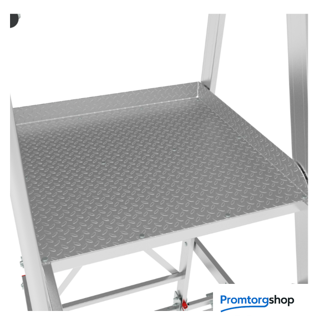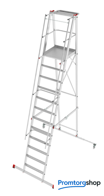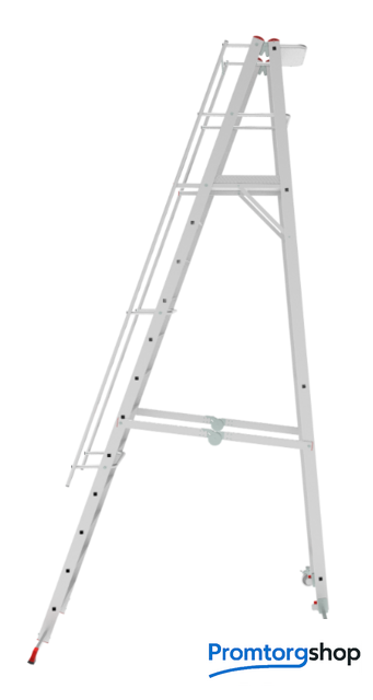 | Тип | лестница передвижная, складная. Мобильные складные подмости для коллективного использования с интенсивными нагрузками снаружи и внутри помещений. Незаменимы для работы на складских стеллажах. Большая рабочая площадка 600×500 мм. Пространство для поворота и боковых перемещений. Трехстороннее ограждение площадки (перила) и страховочная цепь на входе. Точка опоры на высоте. Поручни по обеим сторонам лестницы для безопасного подъема и спуска. Рифленые развальцованные ступени 80 мм (евростандарт) с жестким алюминиевым профилем в основании для надежного сцепления. Вальцовочное крепление ступеней. По прочности не уступает сварке. Компактно складывается для хранения и транспортировки. В сложенном состоянии занимает мало места. Шарнирные замки с автоматической фиксацией регулируются одной рукой. 2 поворотных колесных опоры 125×30 мм с фиксацией угла поворота и тормозом. Широкие опорные траверсы стабилизируют лестницу. Одна из траверс телескопическая, с изменяемой длиной для создания максимально широкой площади опоры. Башмаки траверсы из 2х-компонентного пластика с прорезиненной опорой. Не скользят и не повреждают поверхность. Страна производства: Россия |