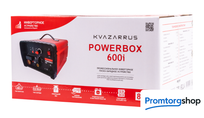 | Комплект поставки | • Инверторное пуско-зарядное устройство KVAZARRUS PowerBox 600i – 1 шт.; • Предохранитель 150 А – 2 шт.; • Токопровод красный «+» с зажимом – 1 шт.; • Токопровод чёрный «-» с зажимом – 1 шт.; • Инструкция по эксплуатации + гарантийный талон – 1 компл. |