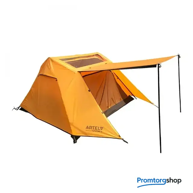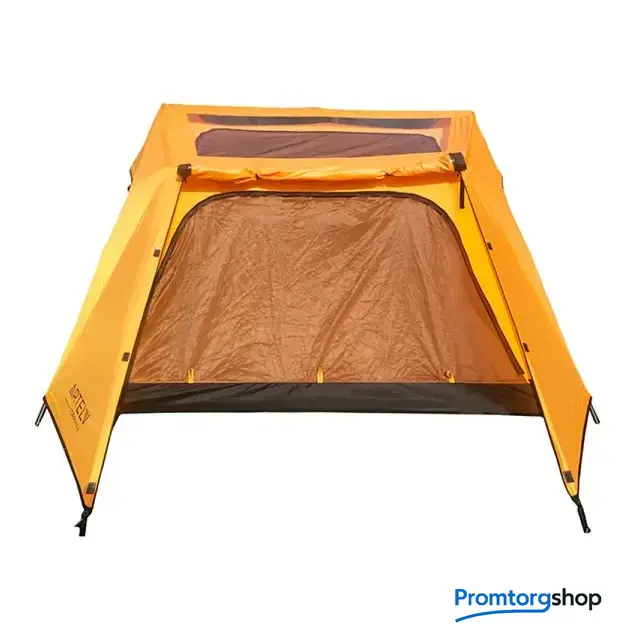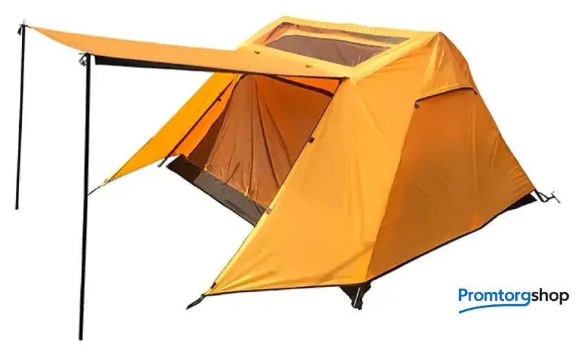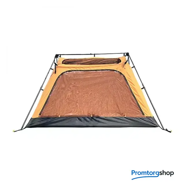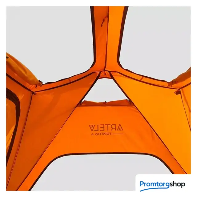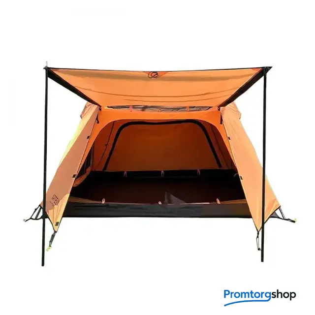 Тип | кемпинговая. Форма палатки нестандартная. Практичная и вместительная кемпинговая палатка с эстетичным внешним видом и малыми габаритами в сложенном состоянии. Быстро собирается на месте силами 1-2 человек, обеспечивает надежную защиту от осадков, солнца, прохлады и насекомых. Отличается продолжительным сроком службы каркаса, тента и фурнитуры, сбалансированной компоновкой дверей и окон, стойкостью к сильным ветровым нагрузкам. Универсальная кемпинговая палатка для различных задач Охота, рыбалка, отдых на дикой природе; Продолжительный автомобильный туризм; Организация лагеря при массовых мероприятиях, сборах; Создание дополнительного жилища на загородном участке. Износостойкий и прочный тент Руководствуясь высокими требованиями к прочности и износостойкости, для изготовления использован полиэстер 210T с усилением Ripstop (делает палатку более прочной на разрыв). Такой материал отличается небольшим весом, но выдерживает экстремальную эксплуатацию, не пропускает влагу, сохраняет форму после длительного использования. К иным достоинствам ткани относят: Стойкость к атмосферным воздействиям, растяжению и механическим повреждениям; Сохранение прохлады при жаркой и тепла при холодной погоде; Устойчивость к выцветанию под палящими лучами солнца; Приятную на ощупь поверхность, минимальный уровень шума в ветер. Красота и практичность Яркий оранжевый цвет стен и крыши хорошо заметен издалека, что снижает риск потерять лагерь из виду при исследовании ближайшей местности. Приятный оттенок наполняет внутреннее пространство гармонией, дарит положительные эмоции как в пасмурную, так и солнечную погоду. Черный пол маскирует частицы грязи, что исключает необходимость в периодической стирке и чистке химическими составами. Стойкость к водяному столбу 3000мм Дополнительный барьер для не проникновения внутрь влаги, создает полиуретановая пропитка тента 3000мм. С ней палатке не страшен проливной дождь, размещение на влажной земле и траве, что подходит для отдыха в регионах с неустойчивым климатом. Комфортный отдых при любой погоде Модульная конструкция позволяет быстро превратить палатку в место для кратковременного отдыха и ночевки или теплое жилище на даче. Сетчатая ткань обеспечивает естественное проветривание и ограничивает доступ насекомых, плотный тент защищает от осадков и ветра. Продуманная вентиляция и освещение С несколькими широкими дверями несложно выбрать место для входа в зависимости от предпочтений и размещения палатки. Панорамные окна на крыше обеспечивают максимум освещения днем и позволяют наслаждаться видами звездного неба ночью. Небольшие треугольные проемы под потолком создают приятный микроклимат в любую погоду. Прозрачные TPU вставки отлично пропускают свет и защищают от осадков, сетчатые – открывают свободный доступ воздуха, препятствуют проникновению насекомых. Дополнительное пространство Широкий навес с легкостью раскрывается перед палаткой при помощи 2 шестов, что открывает возможность разместить под ним кухню или дорожную кладь. К тому же он защищает от попадания сквозь открытую дверь лучей солнца, предотвращает скопление у входа грязи при проливном дожде. Высокопрочные дуги Несущие 19-миллиметровые дуги каркаса выполнены из дюралюминиевого сплава 7001, дополнительные – из стекловоло