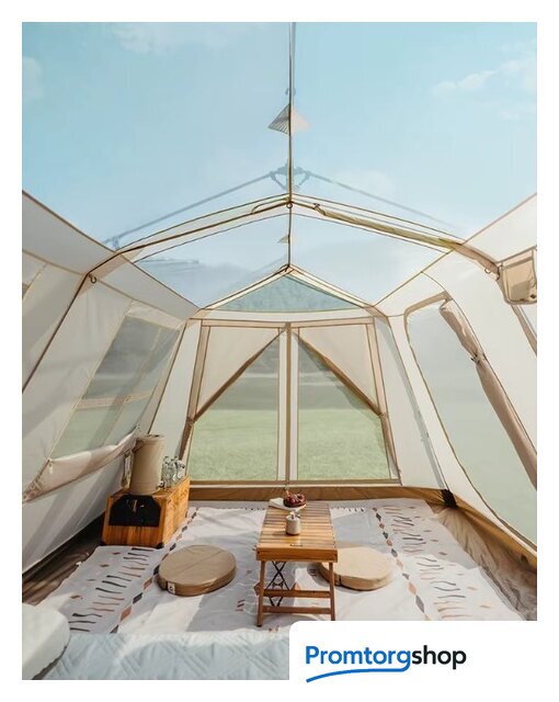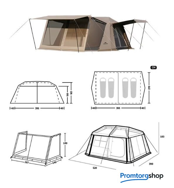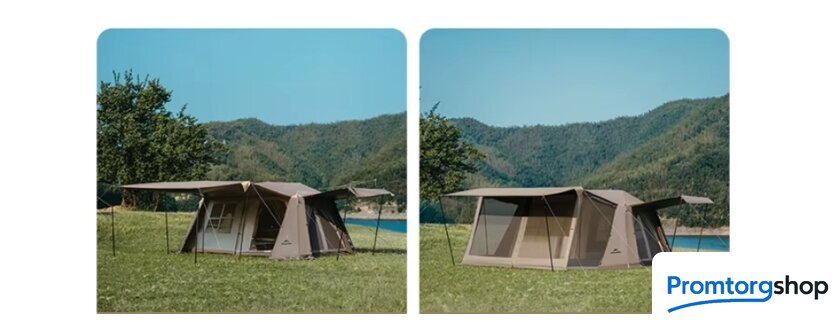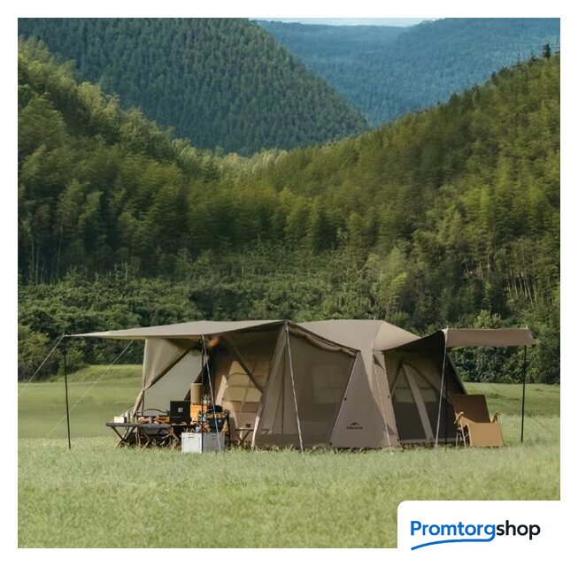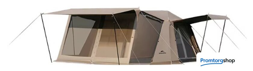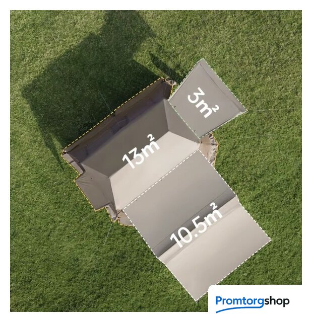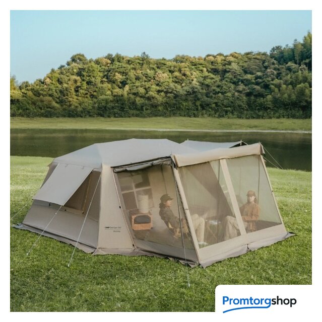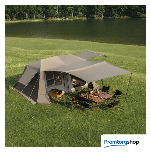 | Тип | кемпинговая. Форма палатки шатровая. Комплектация сумка, инструкция, ввертыш (30 шт.), карманы, крепления для фонарей, противомоскитная сетка, навес (2 шт.). Village 13 Ultimate Edition — комфортный двухкомнатный дом для большой компании, дополненный верандой с отдельным тентом и антимоскитными стенами. Быстрая установка и простая сборка в транспортное состояние будет огромным плюсом в автопутешествии почти любого формата. Огромное пространство — 13 квадратных метров жилой площади, маркиза-козырек над одним из входов площадью 3 квадратных метра и огромный козырек над дополнительной верандой, площадью 10,5 метров. При снятом внешнем тенте получается отличное пространство, огороженное кубиком из москитной сетки. Но можно и надежно укрыться от непогоды, плотно закрыв все стены и окна, оставаясь все равно в огромном внутреннем пространстве. Высота палатки позволит свободно перемещаться внутри даже самым высоким людям. Большое внутреннее пространство позволяет комфортно сидеть или даже стоять внутри палатки. Отлично подойдет для отдыха в формате глэмпинг. Мощные шторы над каждым из окон и над входом позволят надежно укрыться от непогоды и ветра. Тенты над входом создают дополнительный комфорт. Алюминиевый каркас легок и надежен. При использовании обогревающих приборов возможна эксплуатация и в холодную погоду. Установка за 60 секунд Два входа создают дополнительное удобство при эксплуатации и значительно улучшают вентиляцию Пять огромных окон и дверь защищены москитной сеткой Вход спального отделения продублирован москитной сеткой Колышки для ветровых растяжек с световозвращающими головками |
