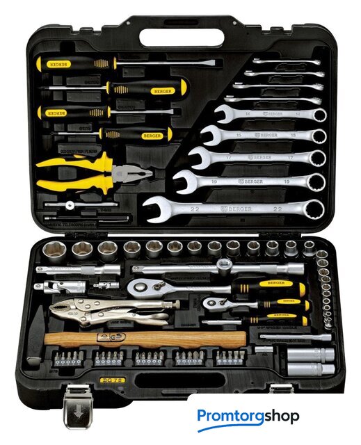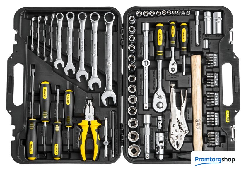 | Комплектация | - 10 шт.: 1/4" Головки торцевые 6-гранные Super Lock: 4, 5, 6, 7, 8, 9, 10, 11, 12, 13 мм- 1 шт.: 1/4" Трещотка (ключ трещоточный с быстрым сбросом): 45 зубов- 1 шт.: 1/4" Удлинитель: 100 мм- 1 шт.: 1/4" Отвертка с присоединительным квадратом- 1 шт.: 1/4" Кардан шарнирный- 1 шт.: 1/4" Вороток Т-образный: 110 мм- 1 шт.: 1/4" Адаптер для бит- 25 шт.: 1/4" Биты в пластиковом держателе:PH (крест): 0, 1, 2, 3, 4PZ (позидрайв): 0, 1, 2, 3, 2Torx (звёздочка): T10, T15, T20, T25, T30Slot (шлиц): 3, 4, 5, 6, 7Hex (шестигранник): 2, 3, 4, 5, 6- 13 шт.: 1/2" Головки торцевые 6-гранные Super Lock: 10, 11, 12, 13, 14, 15, 16, 17, 18, 19, 22, 24, 27 мм- 2 шт.: 1/2" Головки свечные магнитные: 16, 21 мм- 1 шт.: 1/2" Трещотка (ключ трещоточный с быстрым сбросом): 45 зубов- 2 шт.: 1/2" Удлинитель: 125, 250 мм- 1 шт.: 1/2" Шарнир карданный- 1 шт.: 1/2" Переходник скользящий- 1 шт.: Молоток (деревянная ручка): 300 грамм- 9 шт.: Ключи комбинированные: 8, 10, 12, 13, 14, 15, 17, 19, 22 мм- 1 шт.: Зажим с фиксатором- 1 шт.: Пассатижи: 180мм- 4 шт.: Отвертки:Slot (шлиц): 5.5x100, 6.5x150 ммPH (крест): 1x75, 2x100 мм- 1 шт.: Ручка магнитная телескопическая |