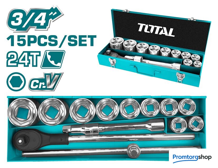 | Комплектация | Торцевые головки: 30мм, 32мм, 34мм, 36мм, 38мм, 41мм, 46мм, 50мм, 55мм, 60мм - 10 шт.Ключ-трещотка - 1 шт.Удлинители 100мм, 200мм - 2 шт.Тройник выдвижной 3/4" 520мм - 1 шт.Кейс металлический |