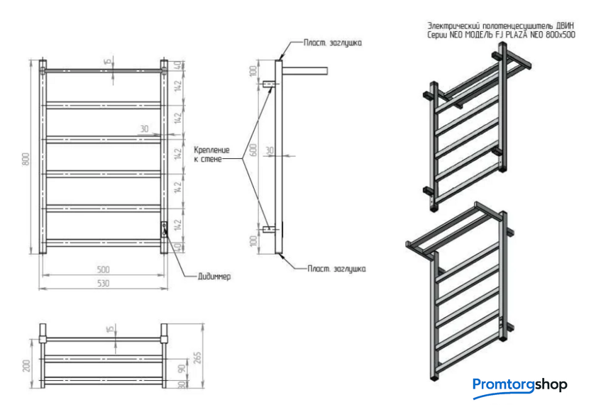 | Тип | Полотенцесушитель Fj plaza Электрический К диммер квадрат позволяет выбирать разные варианты установки. Она может быть открытой и скрытой. В комплекте идут кабель и специальные держатели. Продуманная конструкция модели делает возможным подключение к сети как справа, так и слева. На корпусе изделия расположен блок управления, который позволяет устанавливать таймер на период от 2 до 6 часов, регулировать степень нагрева и полностью отключать устройство. Полка полностью прогревается ! |