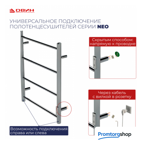 | Тип | Электрический полотенцесушитель J с димером из серии «Neo».Уникальная конструкция позволяет осуществить подключение к электросети, где бы ни находилась розетка — справа или слева.Коробка под скрытый монтаж уже установлена на изделие и окрашена в цвет корпуса.Кабель с вилкой для подключения к розетке и держатели к стене в комплекте. |