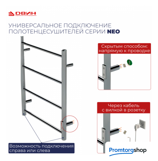 | Тип | Электрический полотенцесушитель из квадратного профиля J plaza с димером из серии "Neo". Уникальная конструкция позволяет осуществить подключение к электросети, где бы ни находилась розетка — справа или слева! Коробка под скрытый монтаж уже установлена на изделие и окрашена в цвет корпуса! Кабель с вилкой для подключения к розетке и держатели к стене в комплекте. |