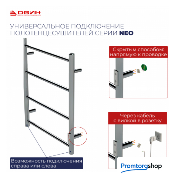 | Тип | 220 В / 50 Гц. Электрический полотенцесушитель L neo — современное и стильное решение для вашей ванной комнаты. Уникальная конструкция позволяет осуществить подключение к электросети, где бы ни находилась розетка — справа или слева! Коробка под скрытый монтаж уже установлена на изделие и окрашена в цвет корпуса. В комплекте также идут кабель с вилкой для подключения к розетке и держатели к стене. Модель отличается низким энергопотреблением, что делает её экономичной и эффективной. Электрический полотенцесушитель L с диммером "NEO" — идеальное сочетание стиля, функциональности и передовых технологий, обеспечивающее комфорт и удобство в вашей ванной комнате. Закажите его сегодня и наслаждайтесь теплом и уютом в вашем доме! |