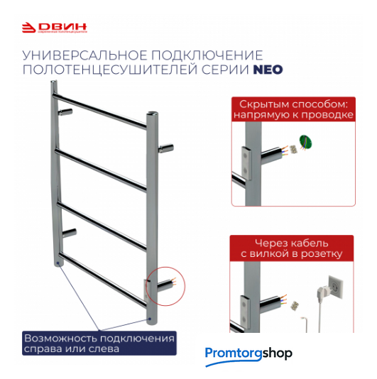 | Тип | Электрический полотенцесушитель ДВИН из квадратного профиля с квадратными перекладинами L plaza с димером из серии "neo". Уникальная конструкция позволяет осуществить подключение к электросети, где бы ни находилась розетка — справа или слева! Коробка под скрытый монтаж уже установлена на изделие и окрашена в цвет корпуса. Кабель с вилкой для подключения к розетке и держатели к стене в комплекте. Страна производства: Россия |