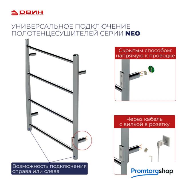 | Тип | Электрический полотенцесушитель R с димером из серии "NEO". Уникальная конструкция позволяет осуществить подключение к электросети, где бы ни находилась розетка — справа или слева! Коробка под скрытый монтаж уже установлена на изделие и окрашена в цвет корпуса! Кабель с вилкой для подключения к розетке и держатели к стене в комплекте. |