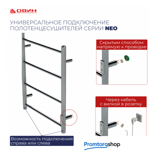 | Тип | Электрический полотенцесушитель R с димером из серии "NEO". Уникальная конструкция позволяет осуществить подключение к электросети, где бы ни находилась розетка — справа или слева! Коробка под скрытый монтаж уже установлена на изделие и окрашена в цвет корпуса! Кабель с вилкой для подключения к розетке и держатели к стене в комплекте. |