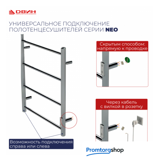 | Тип | Особенности и преимущества: Разнообразие установки: Возможность открытой и скрытой установки позволяет выбрать оптимальный вариант для вашего помещения. Универсальное подключение: Продуманная конструкция позволяет подключать устройство к сети как справа, так и слева. Полностью прогреваемая полка: Обеспечивает равномерный нагрев и удобство использования. Управление: Блок управления на корпусе позволяет устанавливать таймер на период от 2 до 6 часов, регулировать степень нагрева и полностью отключать устройство. Модель отличается низким энергопотреблением, что делает её экономичной и эффективной. Электрический полотенцесушитель Neo идеальное сочетание стиля, функциональности и удобства. Обеспечьте комфорт и уют в вашем доме с помощью этого высококачественного устройства. Страна производства: Россия |