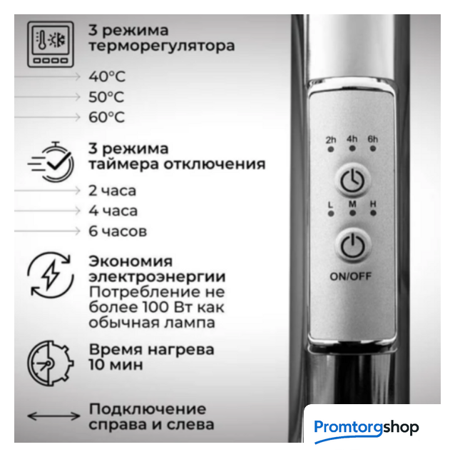 Тип | электрический. Описание Электрический полотенцесушитель Маргроид Ferrum Вид 10 изготовлен из конструкционной стали. Устанавливается на 4 опоры. Внутри полотенцесушителя протянут нагревательный шнур. С правой стороны установлен диммер со световой индикацией, позволяющий выставить температуру и таймер нагрева. Выводы для подключения к электросети предусмотрены с обеих сторон. Полотенцесушитель имеет 3 терморежима (40℃, 50℃, 60℃) и 3 режима таймера (2, 4 или 6 часов). Маргроид Ferrum Вид 10 позволяет экономить электроэнергию, так как потребляет не более 100 Вт, что сравнимо с обычной лампочкой. Время нагрева составляет 10 минут. |