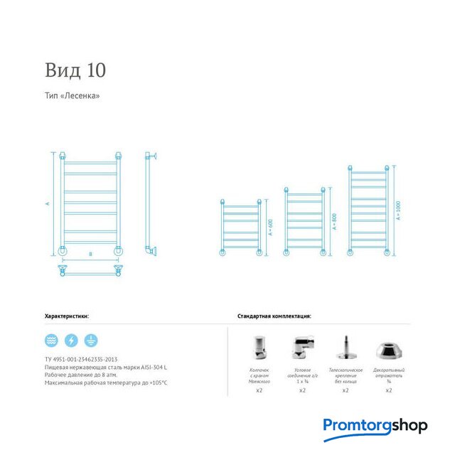 | Комплектация | - полотенцесушитель; - колпачок с краком маевским 2 шт; - телескопическое преление 2 шт; - соединение угловое 1*3/4 г/г пара; - отражатели 2шт; - гарантийный талон. |