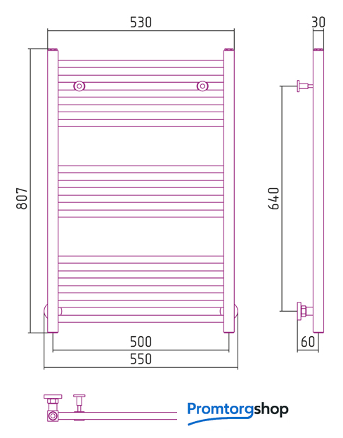 | Посадочное (межосевое) расстояние | 500 мм (- при нижнем подключении) |